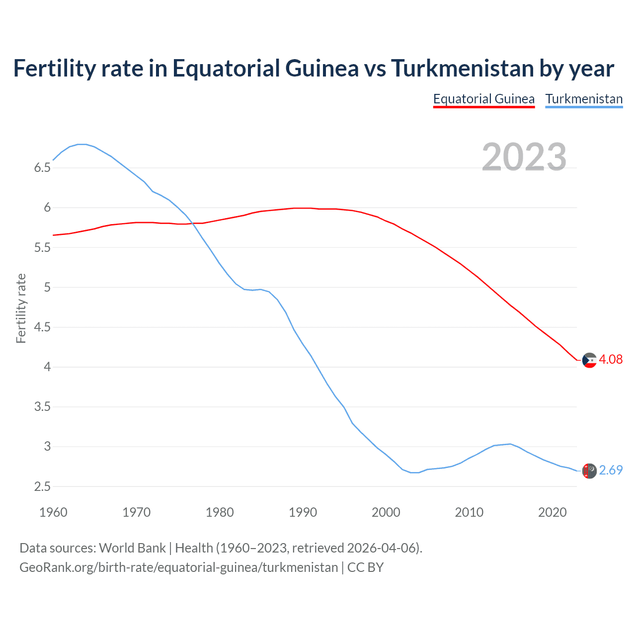 1960 vs 2023, the fertility rate has decreased by 27.8% in Equatorial Guinea and by 59.2% in Turkmenistan — in 1960, it was 5.65 and 6.59, respectively.