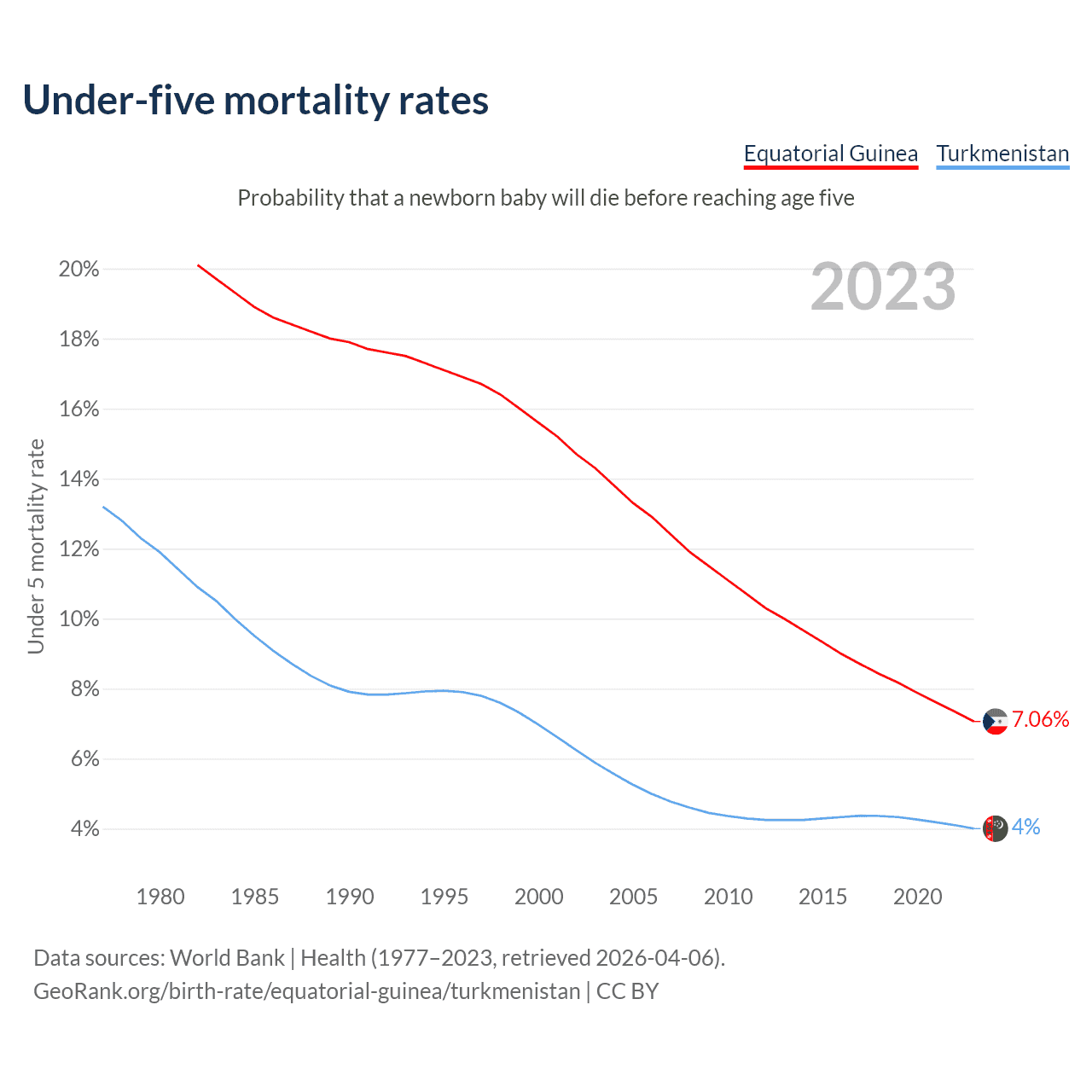 The chance that a newborn baby will die before reaching age five is 7.06% in Equatorial Guinea and 4% in Turkmenistan. Above is a chart with historical data on under-five mortality rates.