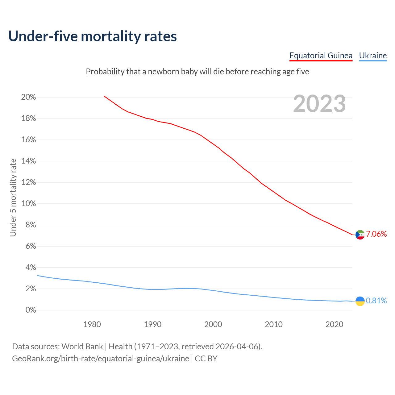 The chance that a newborn baby will die before reaching age five is 7.06% in Equatorial Guinea and 0.81% in Ukraine. Above is a chart with historical data on under-five mortality rates.