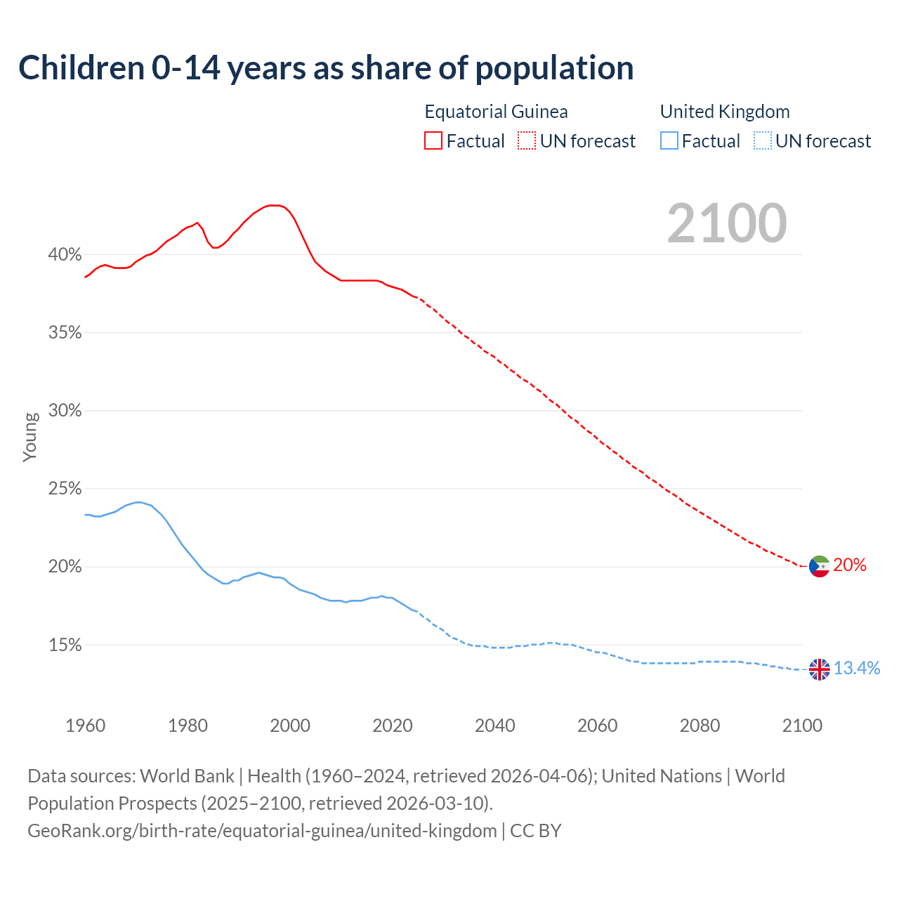 Equatorial Guinea has an annual birth rate of 29.6 births per 1,000 people, compared to 10 for the United Kingdom. The average number of children a woman is expected to have during her lifetime — the fertility rate, is 4.08 in Equatorial Guinea and 1.56 in the United Kingdom — 61.8% difference.