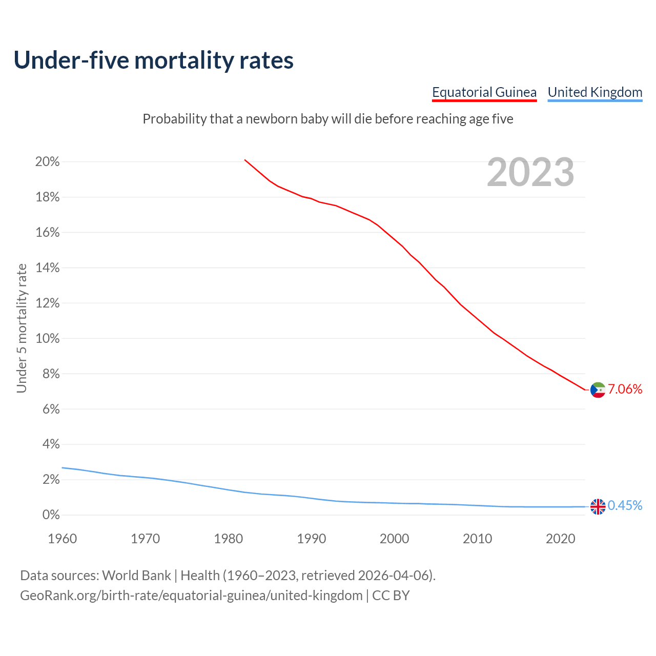 The chance that a newborn baby will die before reaching age five is 7.06% in Equatorial Guinea and 0.45% in the United Kingdom. Above is a chart with historical data on under-five mortality rates.