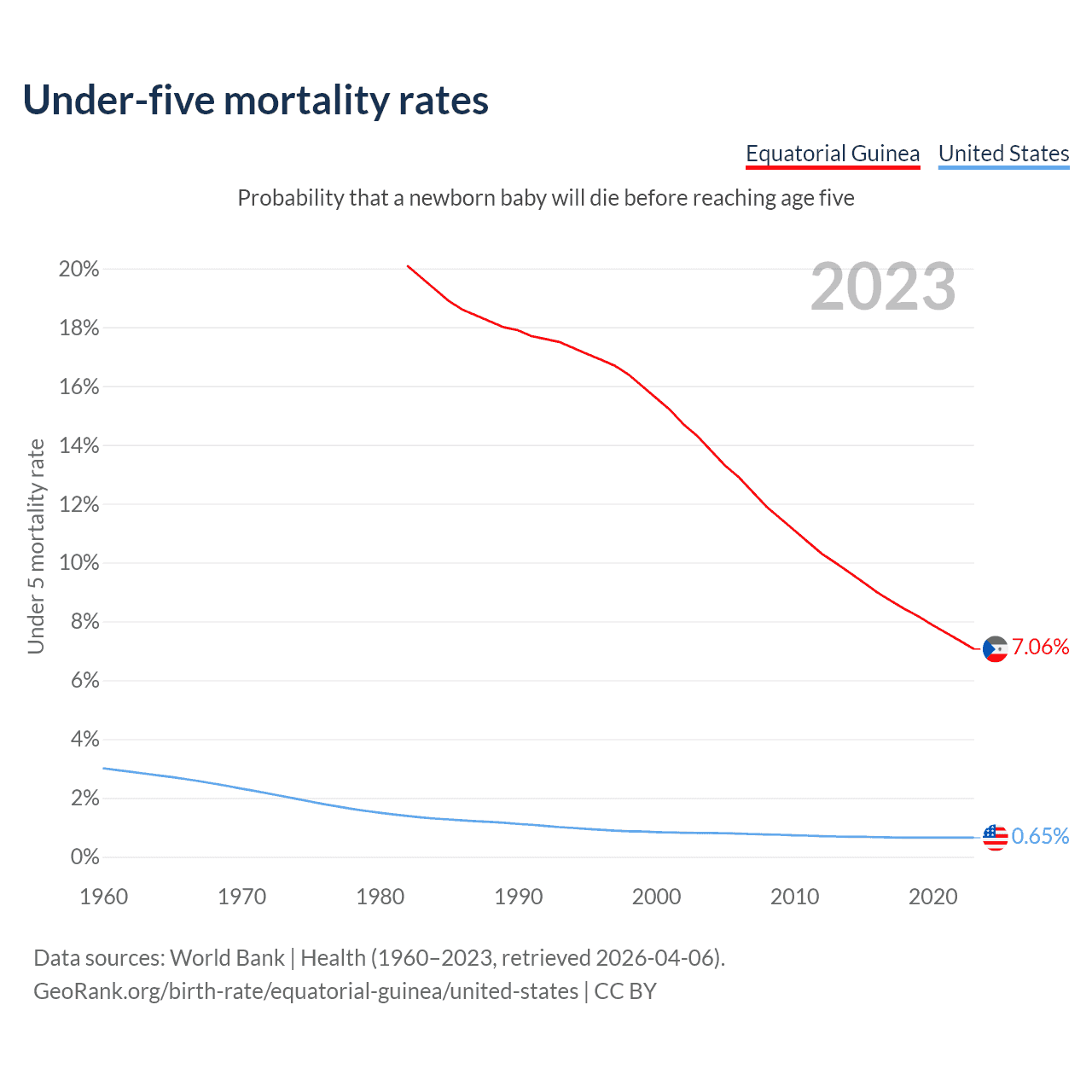 The chance that a newborn baby will die before reaching age five is 7.06% in Equatorial Guinea and 0.65% in the United States. Above is a chart with historical data on under-five mortality rates.