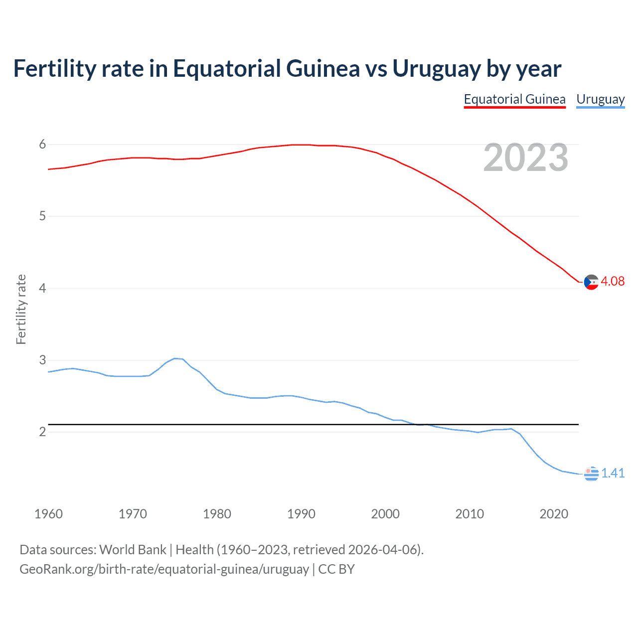 According to the latest available data on birth rates, the fertility rate in Equatorial Guinea was 4.08 children per woman in 2023, compared to 1.41 in Uruguay in 2023. The replacement level is considered to be 2.1 children per woman.