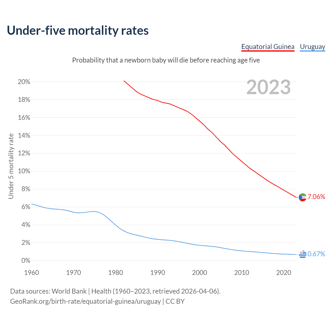 The chance that a newborn baby will die before reaching age five is 7.06% in Equatorial Guinea and 0.67% in Uruguay. Above is a chart with historical data on under-five mortality rates.