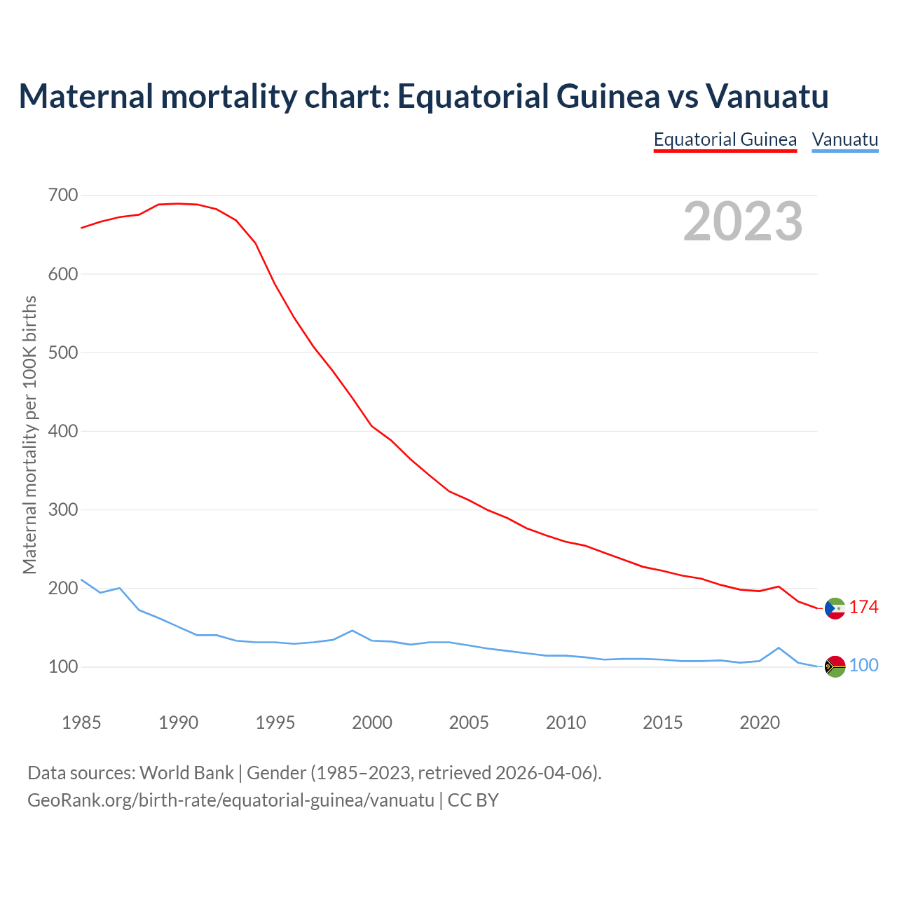 The maternal mortality rate, which is the probability of dying during childbirth or within 42 days of pregnancy termination, is 174 deaths per 100,000 live births in Equatorial Guinea, compared to 100 deaths in Vanuatu.