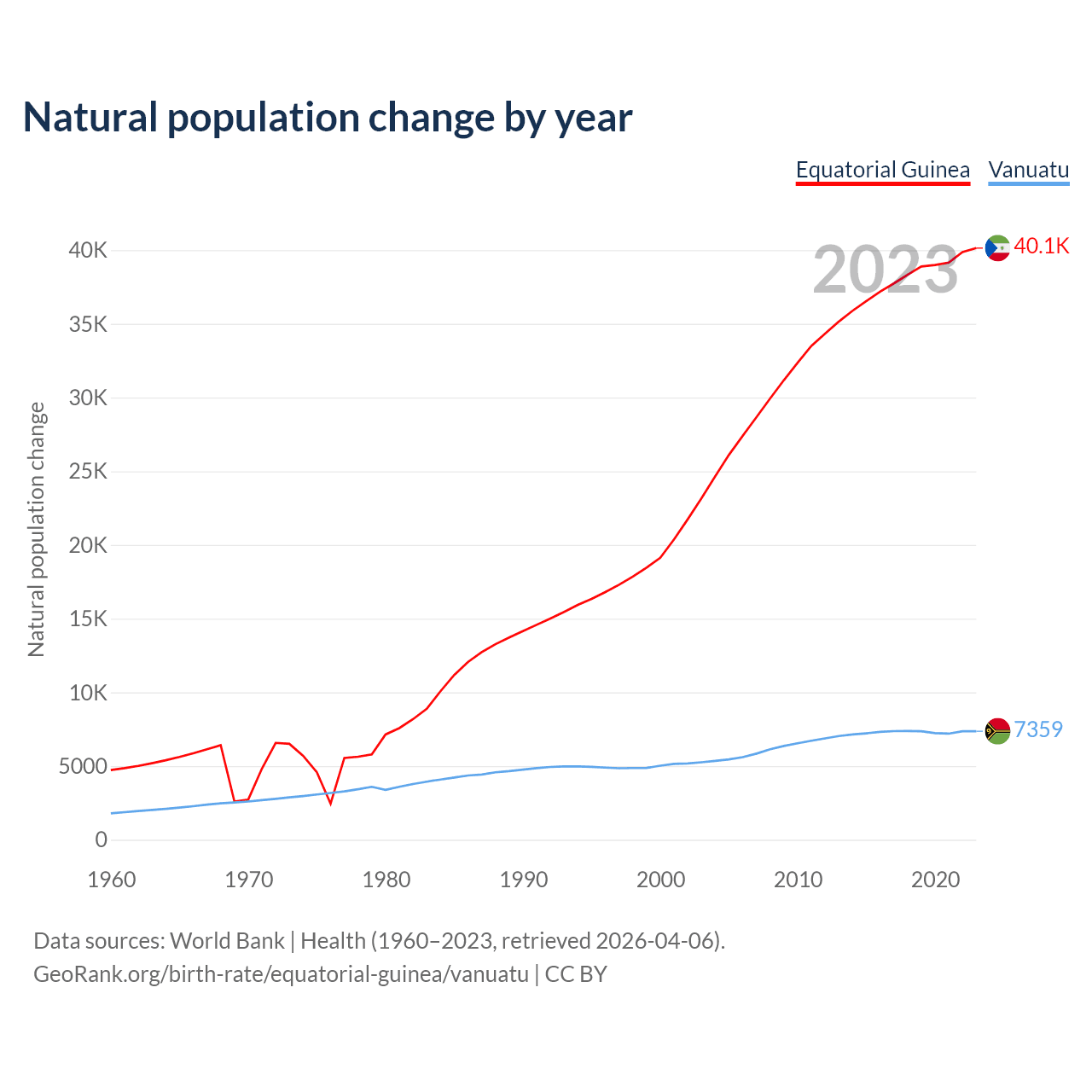 According to the latest available data on birth rates, the fertility rate in Equatorial Guinea was 4.08 children per woman in 2023, compared to 3.6 in Vanuatu in 2023. The replacement level is considered to be 2.1 children per woman.