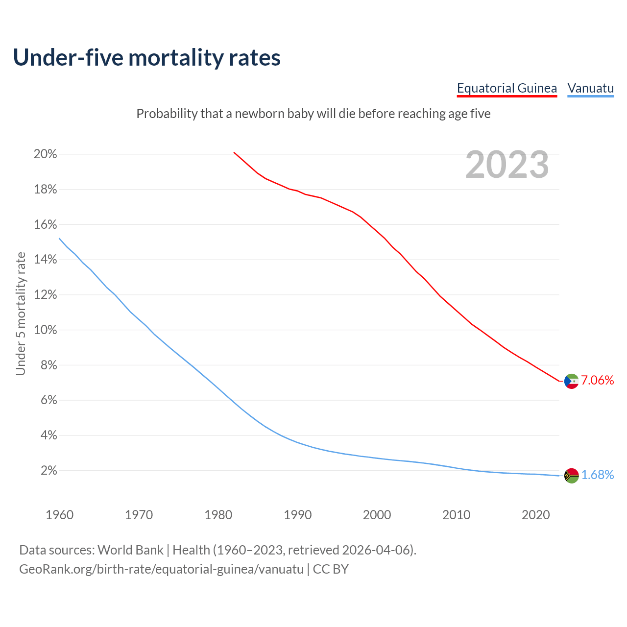 The chance that a newborn baby will die before reaching age five is 7.06% in Equatorial Guinea and 1.68% in Vanuatu. Above is a chart with historical data on under-five mortality rates.