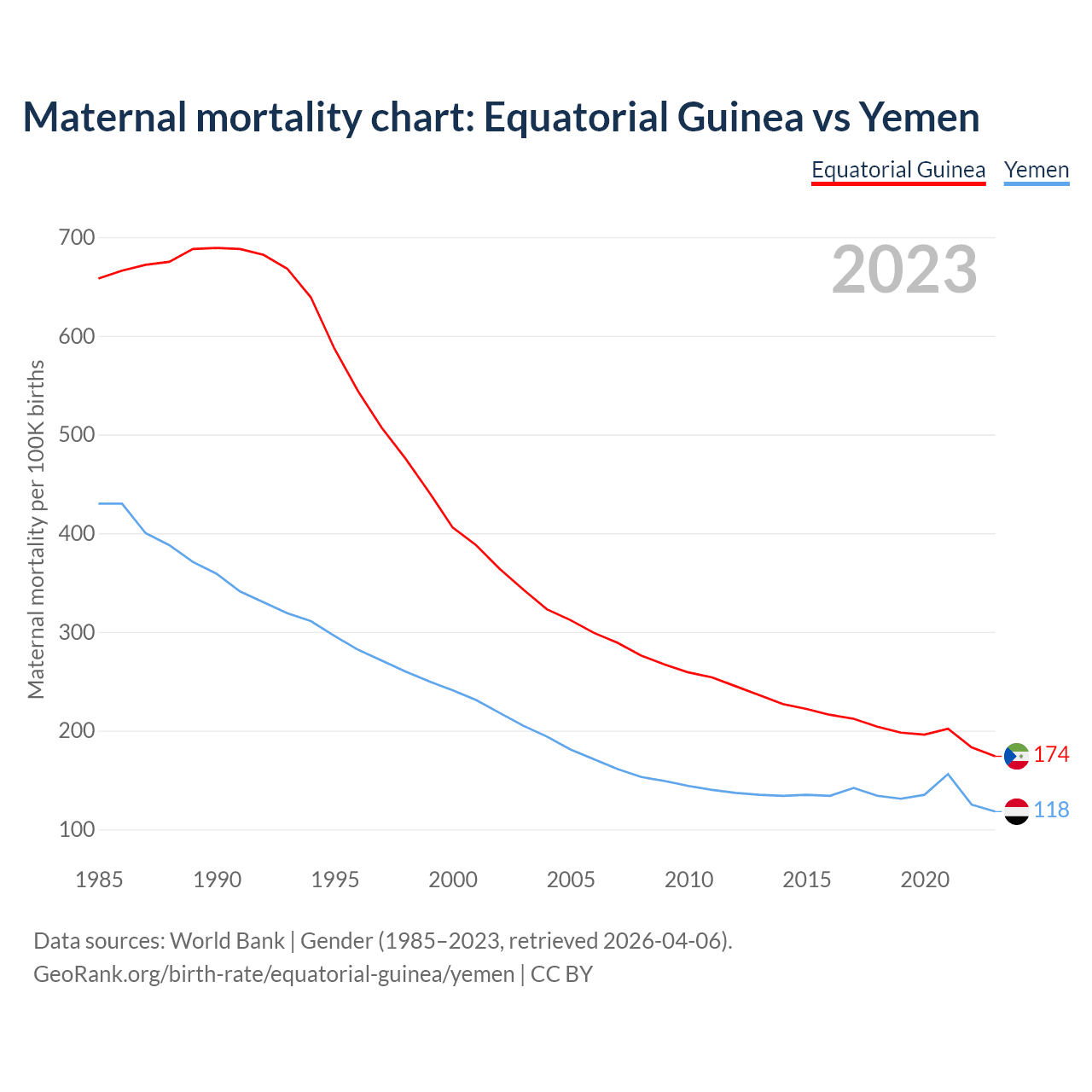 Data sources: World Bank | Gender (1985–2023, retrieved 2026-04-06).