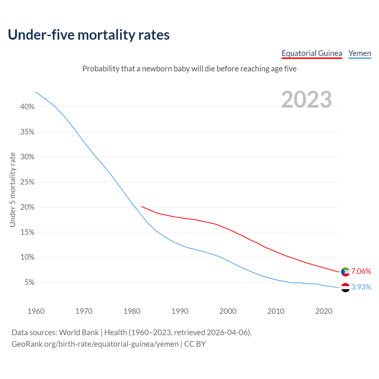 The chance that a newborn baby will die before reaching age five is 7.06% in Equatorial Guinea and 3.93% in Yemen. Above is a chart with historical data on under-five mortality rates.