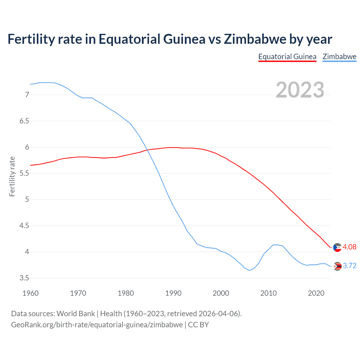 1960 vs 2023, the fertility rate has decreased by 27.8% in Equatorial Guinea and by 48.2% in Zimbabwe — in 1960, it was 5.65 and 7.2, respectively.