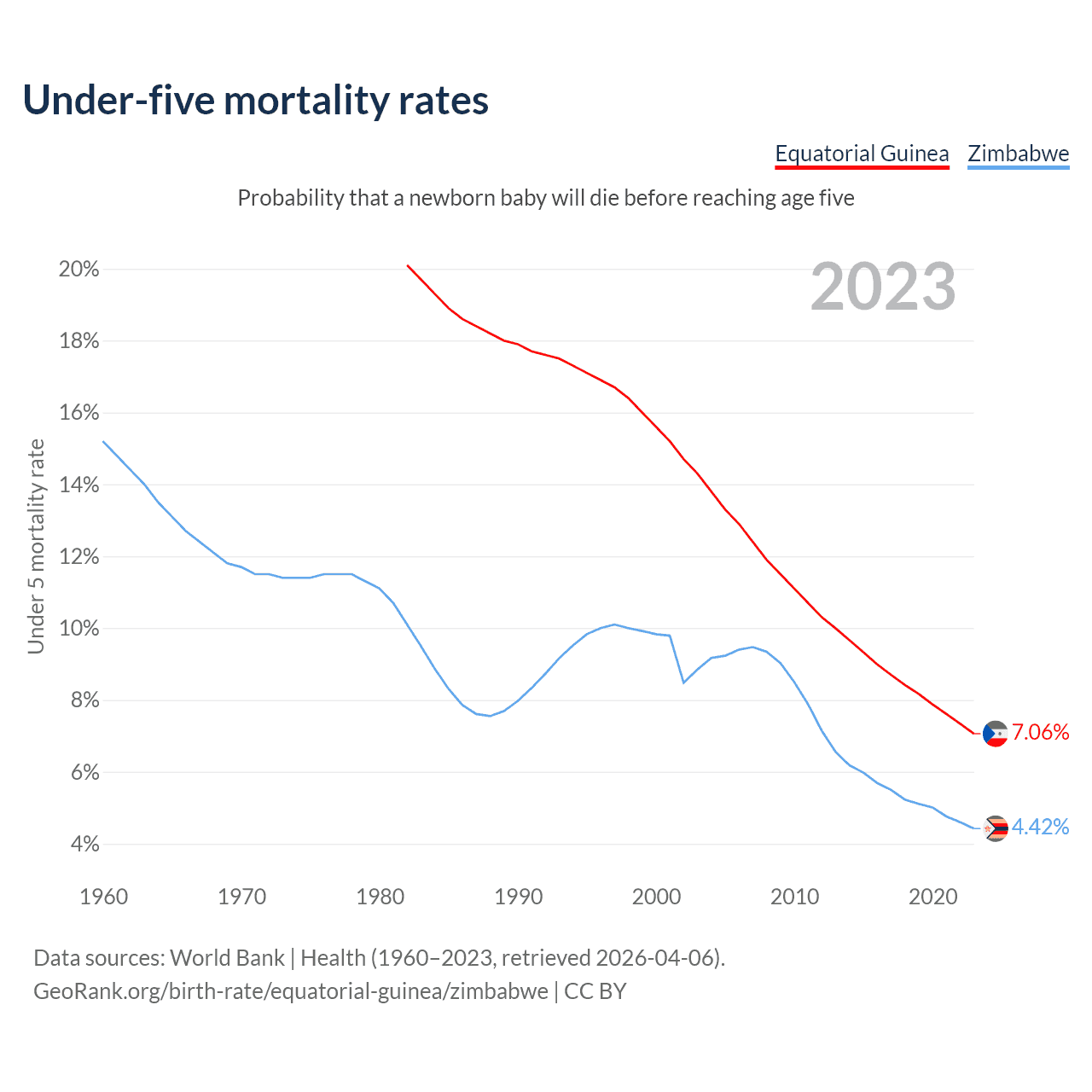 The chance that a newborn baby will die before reaching age five is 7.06% in Equatorial Guinea and 4.42% in Zimbabwe. Above is a chart with historical data on under-five mortality rates.