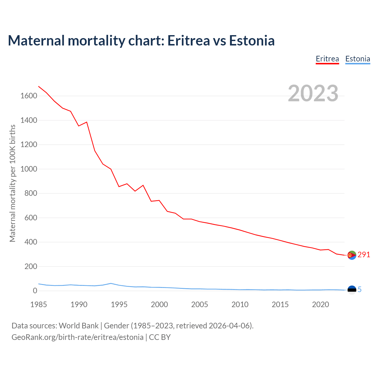 The maternal mortality rate, which is the probability of dying during childbirth or within 42 days of pregnancy termination, is 291 deaths per 100,000 live births in Eritrea, compared to 5 deaths in Estonia.