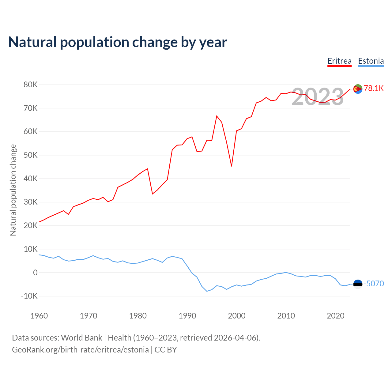 According to the latest available data on birth rates, the fertility rate in Eritrea was 3.71 children per woman in 2023, compared to 1.31 in Estonia in 2023. The replacement level is considered to be 2.1 children per woman.