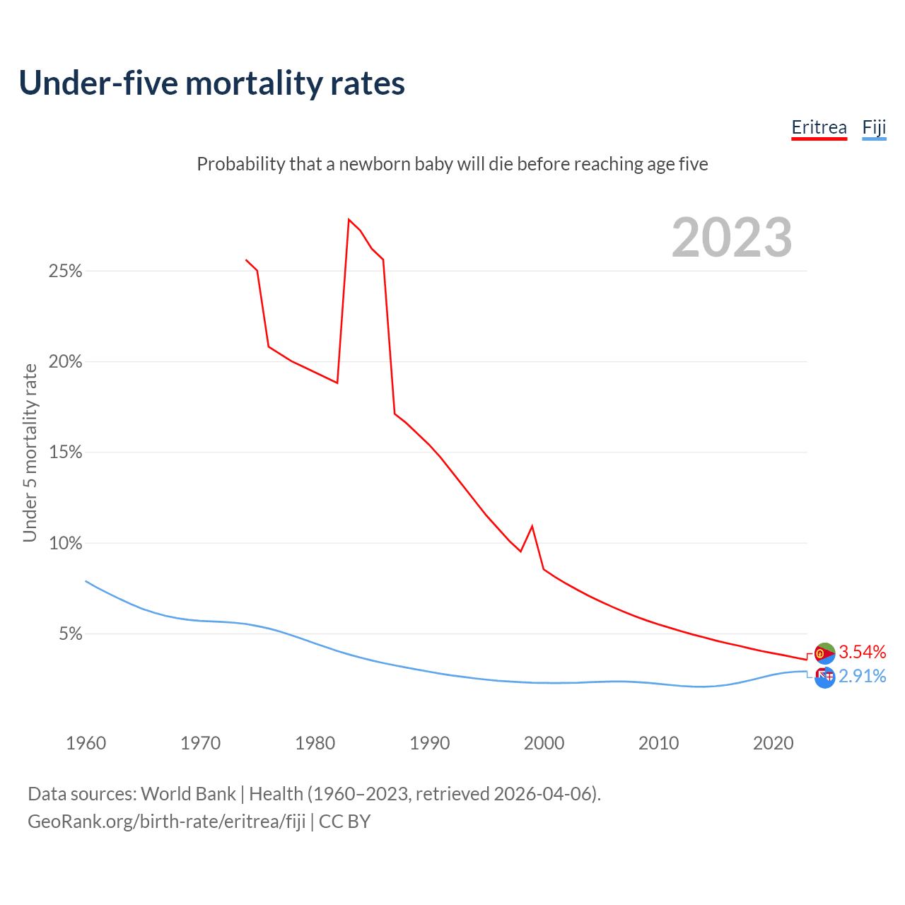 The chance that a newborn baby will die before reaching age five is 3.54% in Eritrea and 2.91% in Fiji. Above is a chart with historical data on under-five mortality rates.