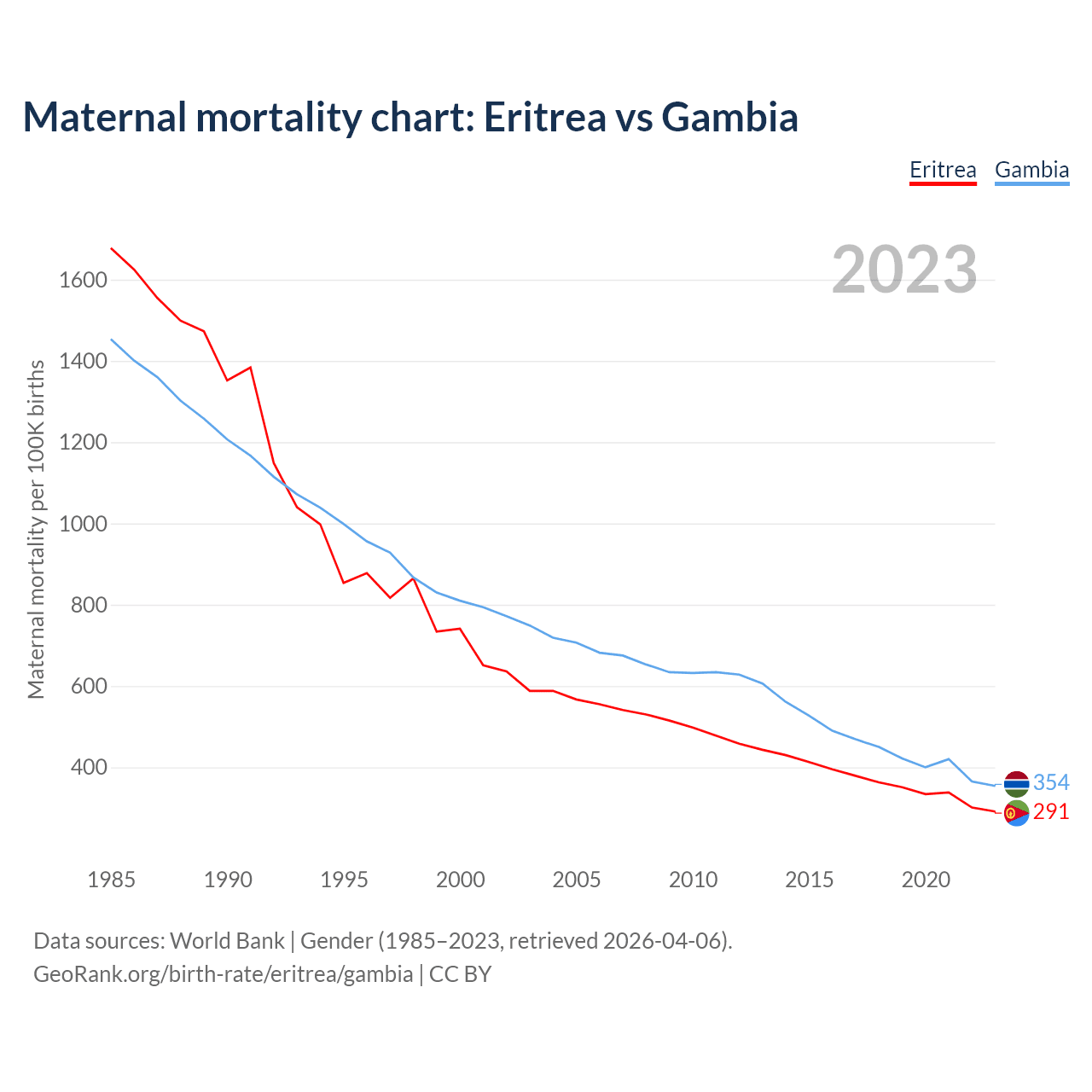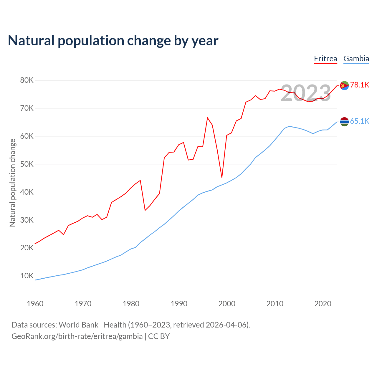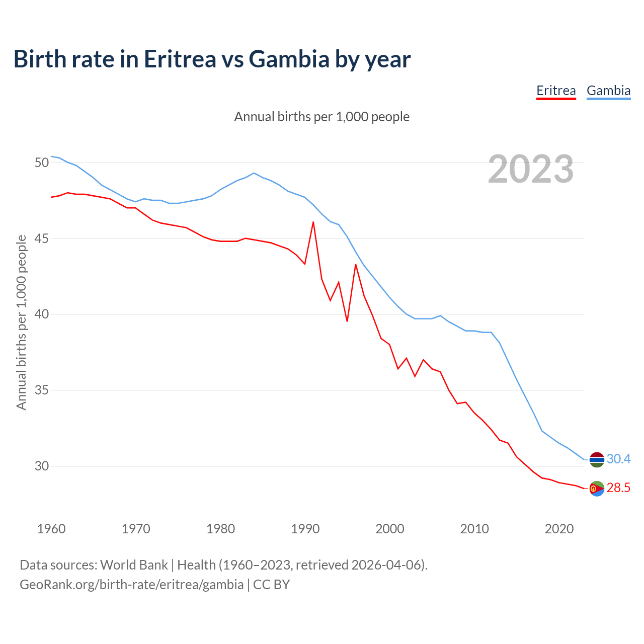 Eritrea has an annual birth rate of 28.5 births per 1,000 people, compared to 30.4 for the Gambia. The average number of children a woman is expected to have during her lifetime — the fertility rate, is 3.71 in Eritrea and 4.01 in the Gambia — 7.89% difference.