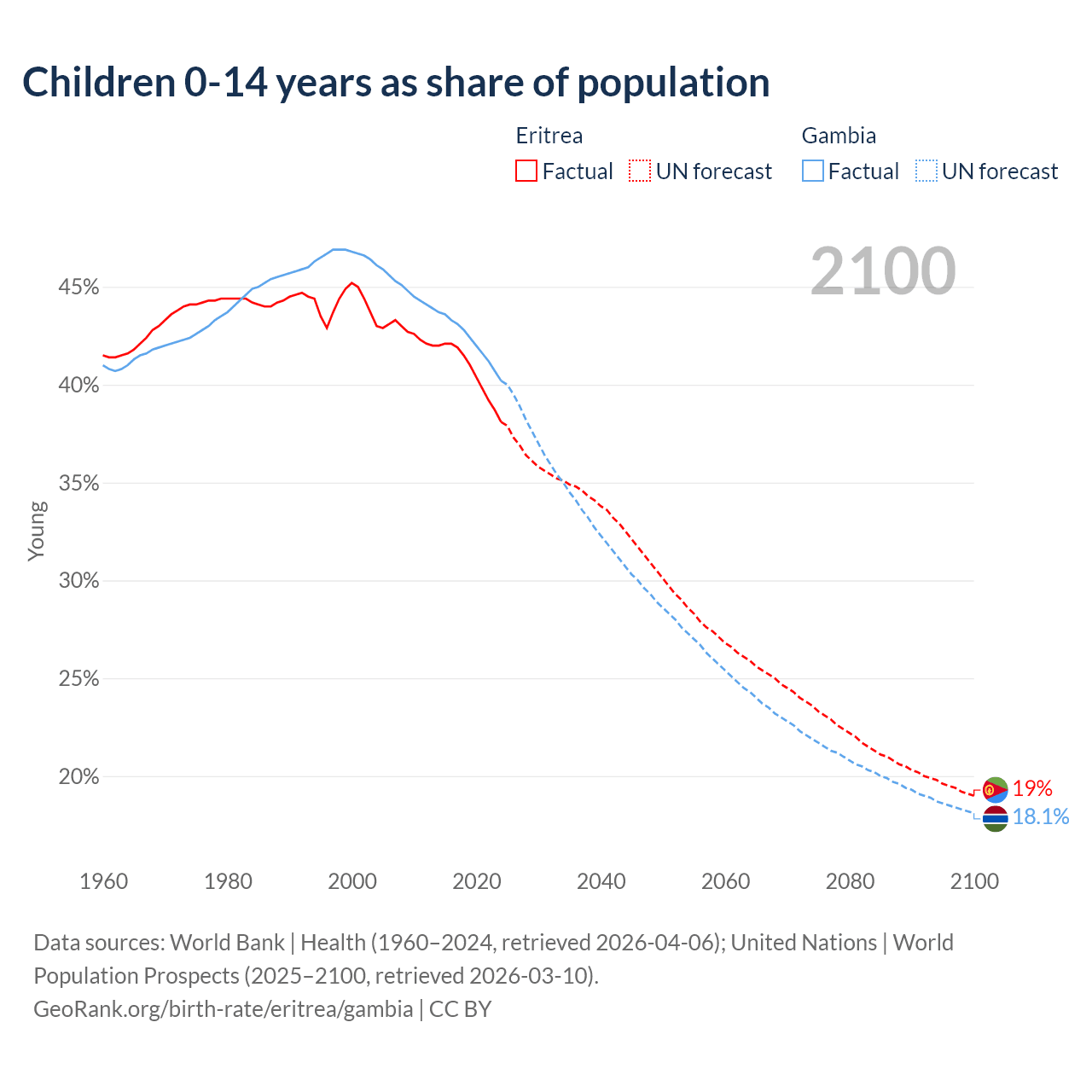 According to the latest available data on birth rates, the fertility rate in Eritrea was 3.71 children per woman in 2023, compared to 4.01 in the Gambia in 2023. The replacement level is considered to be 2.1 children per woman.
