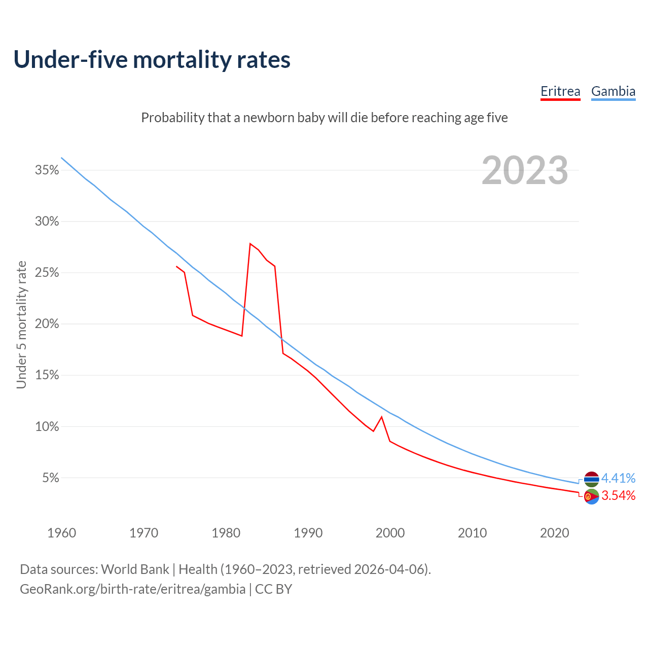 The chance that a newborn baby will die before reaching age five is 3.54% in Eritrea and 4.41% in the Gambia. Above is a chart with historical data on under-five mortality rates.