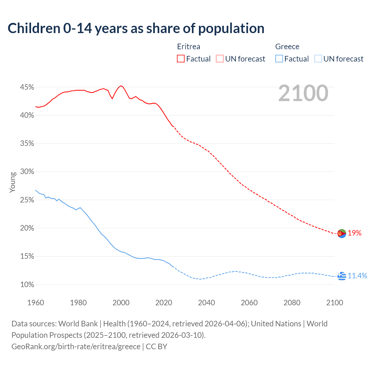 Eritrea has an annual birth rate of 28.5 births per 1,000 people, compared to 6.8 for Greece. The average number of children a woman is expected to have during her lifetime — the fertility rate, is 3.71 in Eritrea and 1.32 in Greece — 64.4% difference.