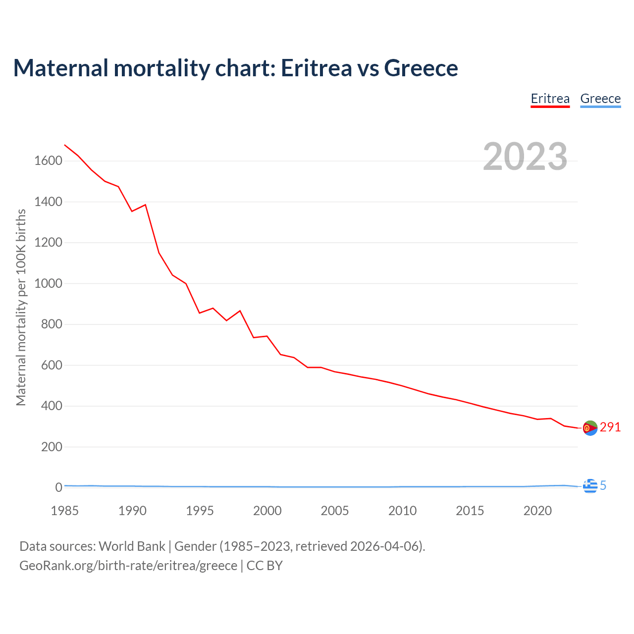 The maternal mortality rate, which is the probability of dying during childbirth or within 42 days of pregnancy termination, is 291 deaths per 100,000 live births in Eritrea, compared to 5 deaths in Greece.
