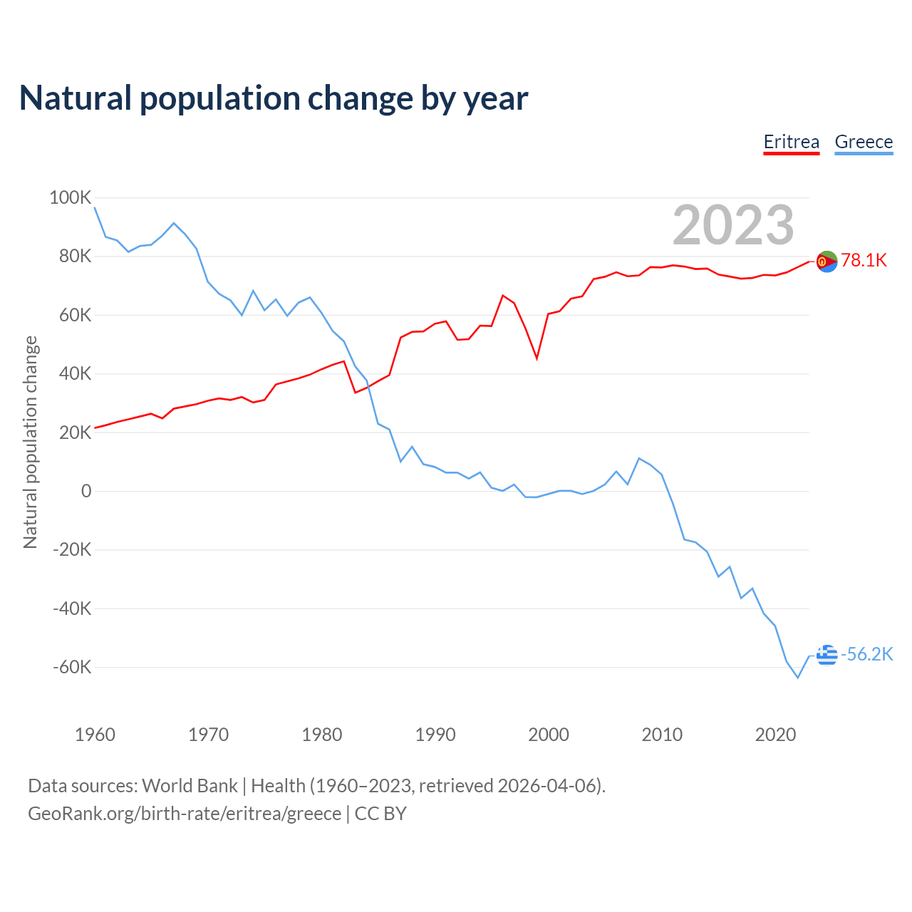 According to the latest available data on birth rates, the fertility rate in Eritrea was 3.71 children per woman in 2023, compared to 1.32 in Greece in 2023. The replacement level is considered to be 2.1 children per woman.