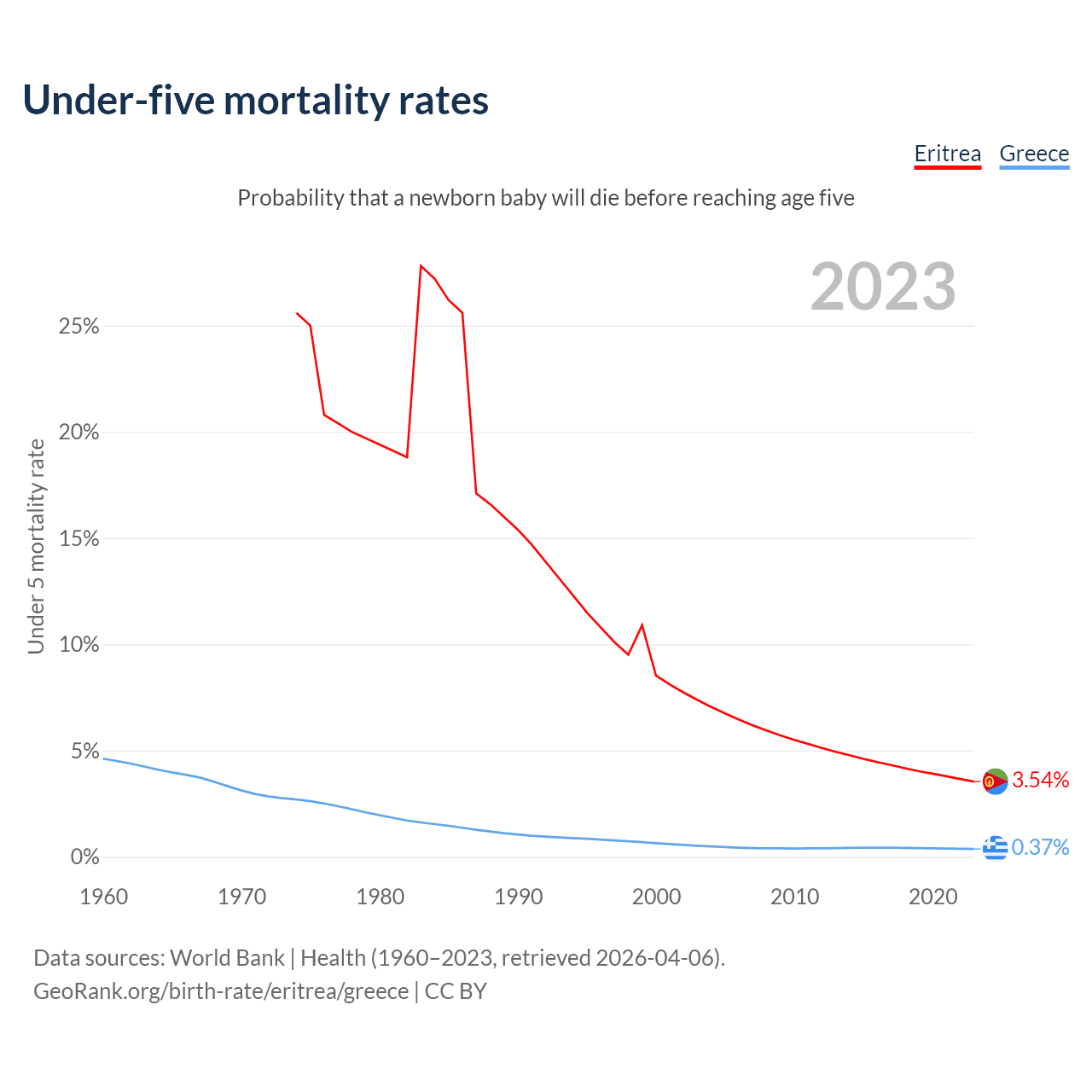 The chance that a newborn baby will die before reaching age five is 3.54% in Eritrea and 0.37% in Greece. Above is a chart with historical data on under-five mortality rates.
