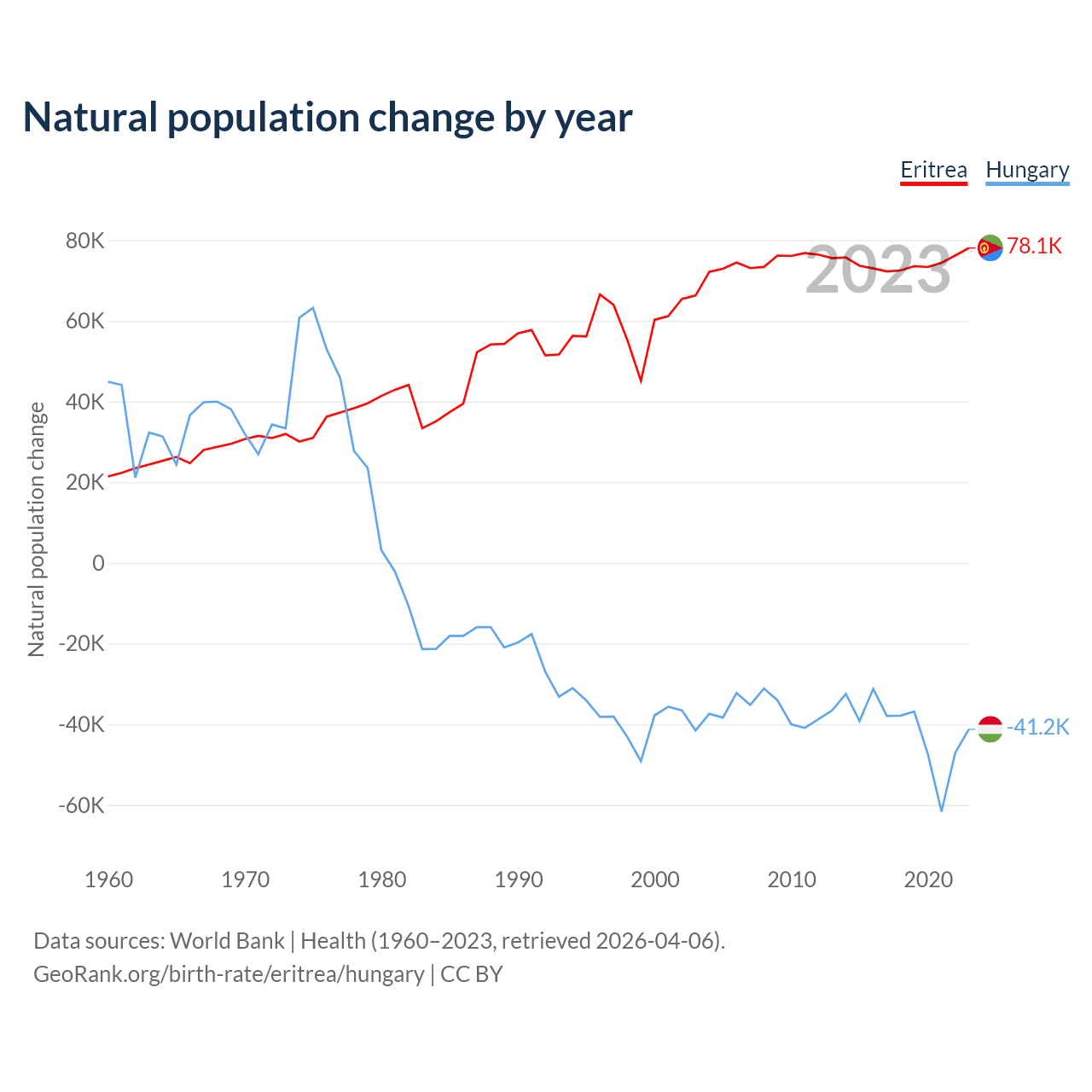 Eritrea has an annual birth rate of 28.5 births per 1,000 people, compared to 9.1 for Hungary. The average number of children a woman is expected to have during her lifetime — the fertility rate, is 3.71 in Eritrea and 1.51 in Hungary — 59.3% difference.