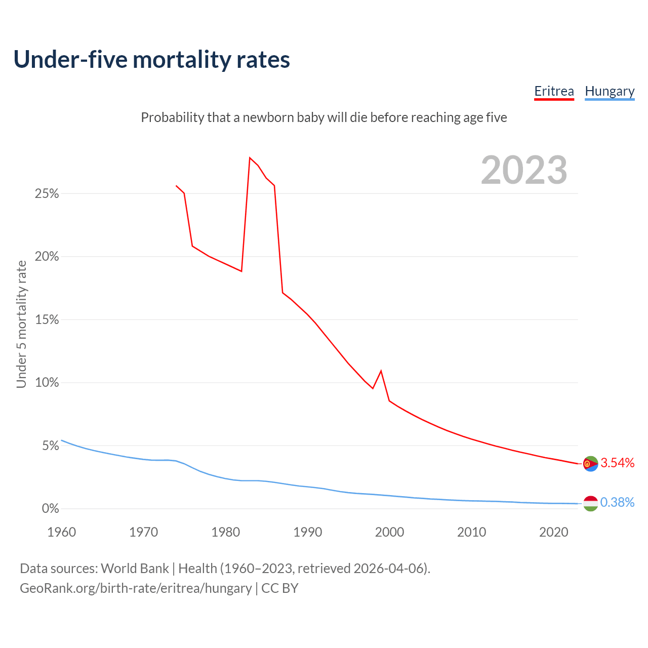 The chance that a newborn baby will die before reaching age five is 3.54% in Eritrea and 0.38% in Hungary. Above is a chart with historical data on under-five mortality rates.