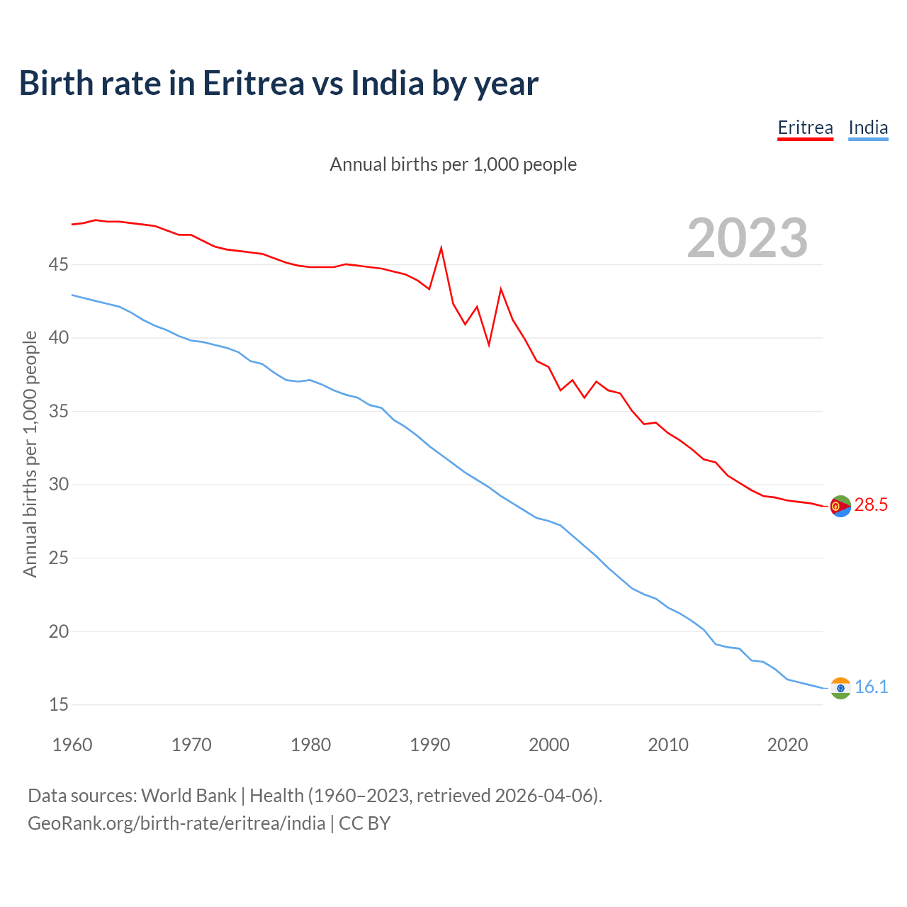 Eritrea has an annual birth rate of 28.5 births per 1,000 people, compared to 16.1 for India. The average number of children a woman is expected to have during her lifetime — the fertility rate, is 3.71 in Eritrea and 1.98 in India — 46.8% difference.