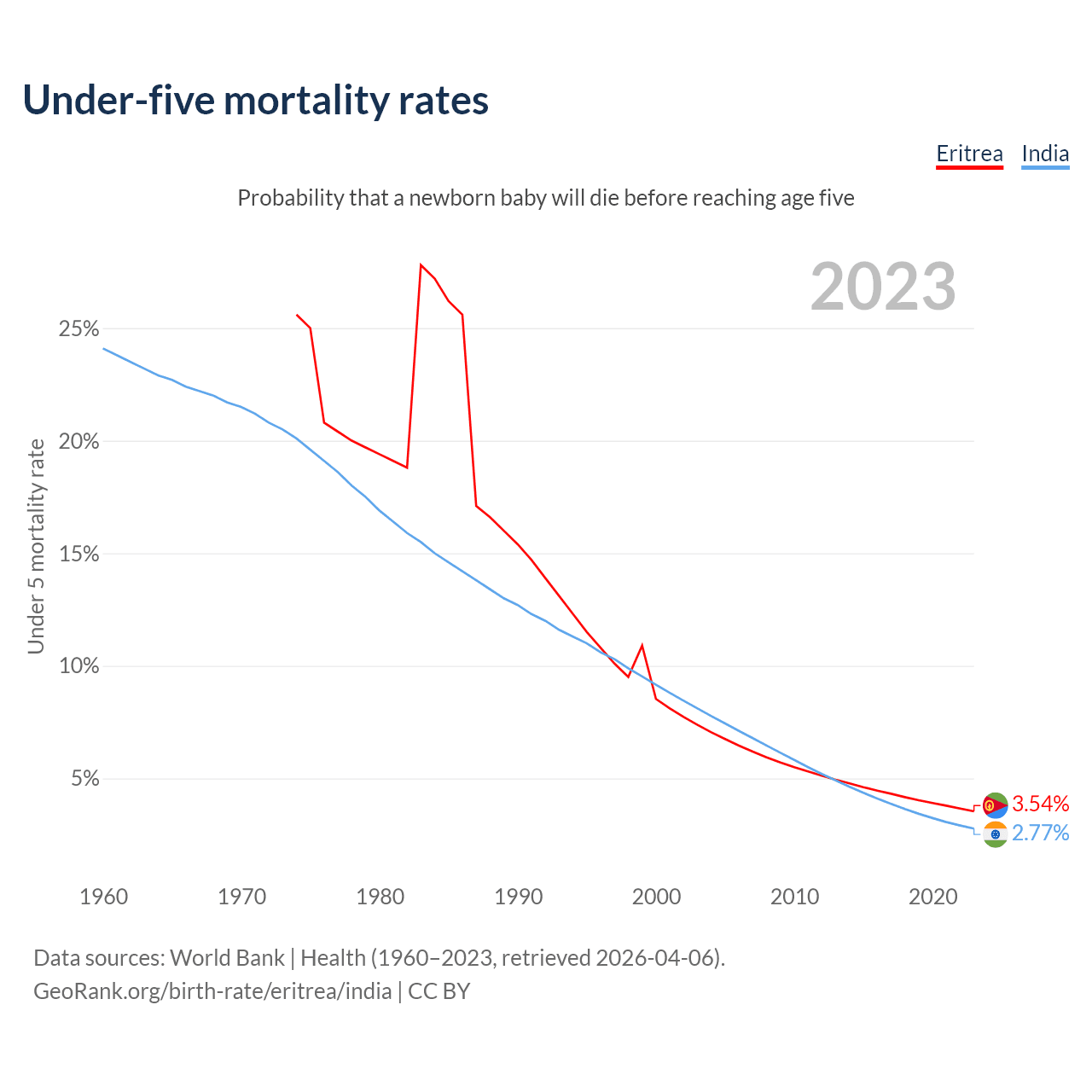 The chance that a newborn baby will die before reaching age five is 3.54% in Eritrea and 2.77% in India. Above is a chart with historical data on under-five mortality rates.
