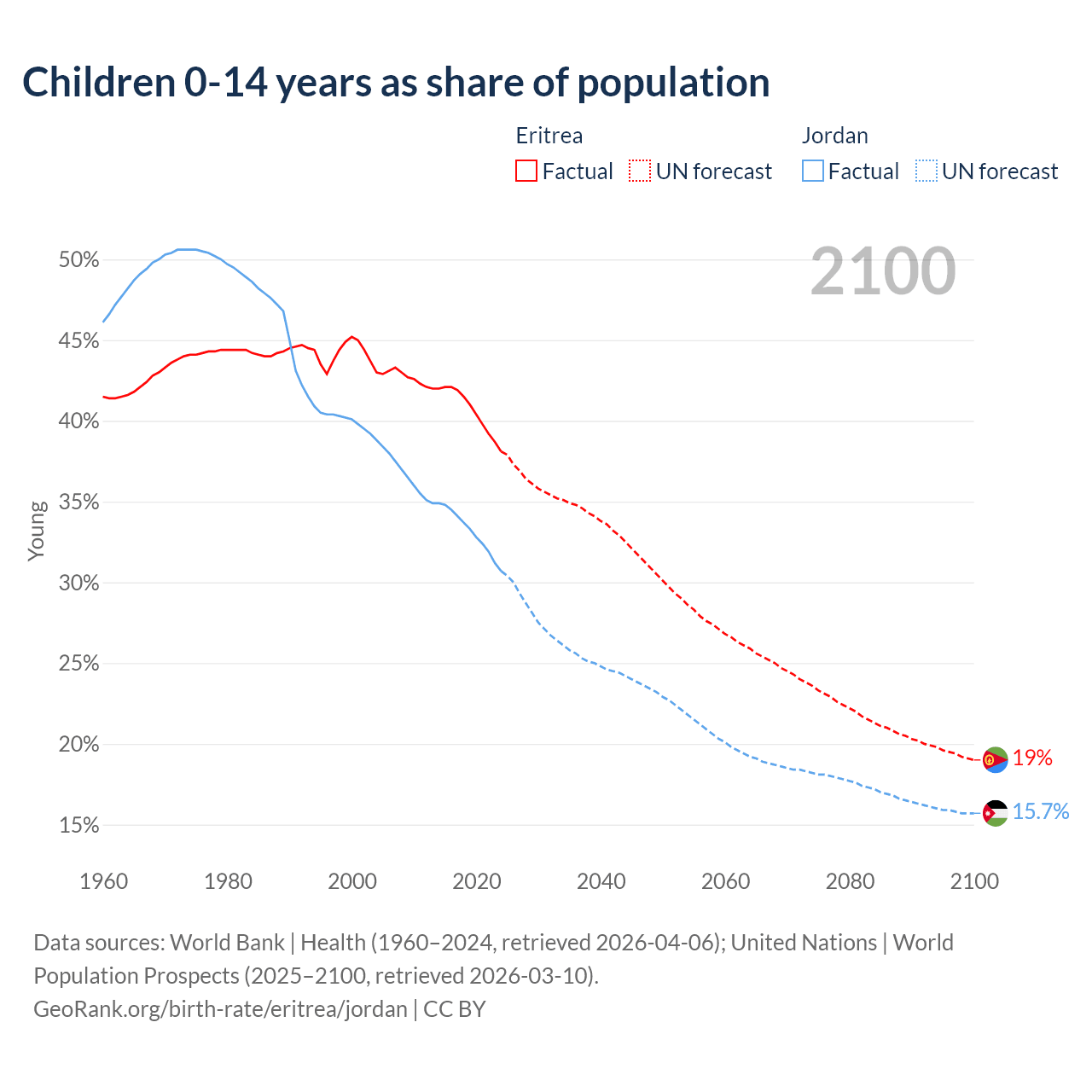 According to the latest available data on birth rates, the fertility rate in Eritrea was 3.71 children per woman in 2023, compared to 2.64 in Jordan in 2023. The replacement level is considered to be 2.1 children per woman.