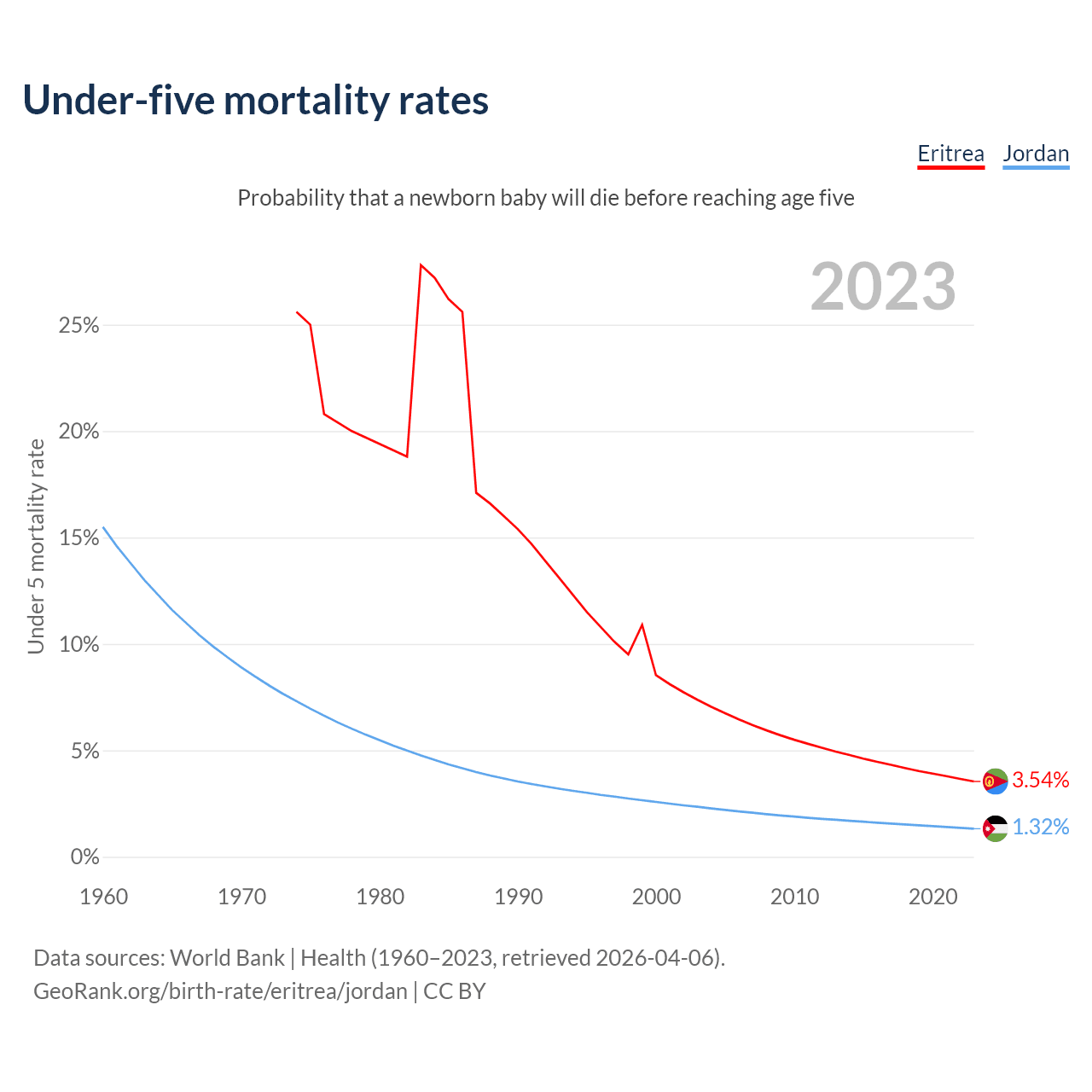 The chance that a newborn baby will die before reaching age five is 3.54% in Eritrea and 1.32% in Jordan. Above is a chart with historical data on under-five mortality rates.