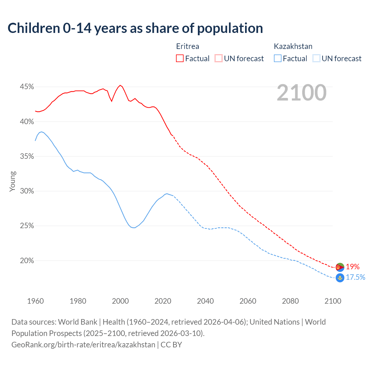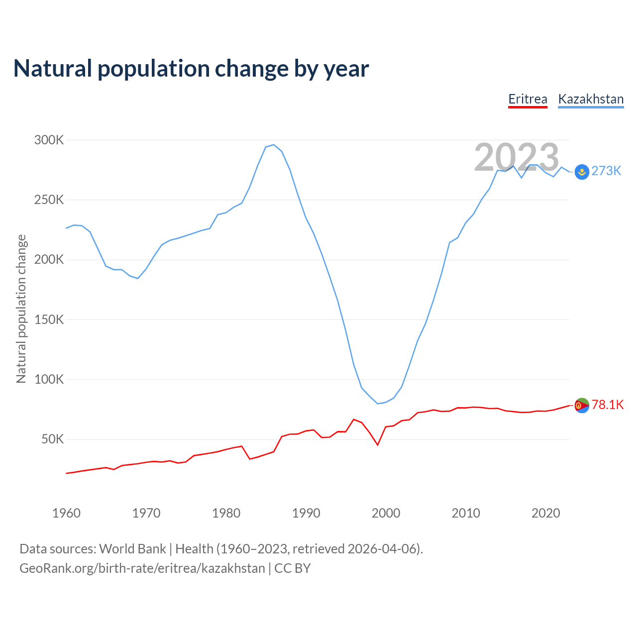 According to the latest available data on birth rates, the fertility rate in Eritrea was 3.71 children per woman in 2023, compared to 3.01 in Kazakhstan in 2023. The replacement level is considered to be 2.1 children per woman.