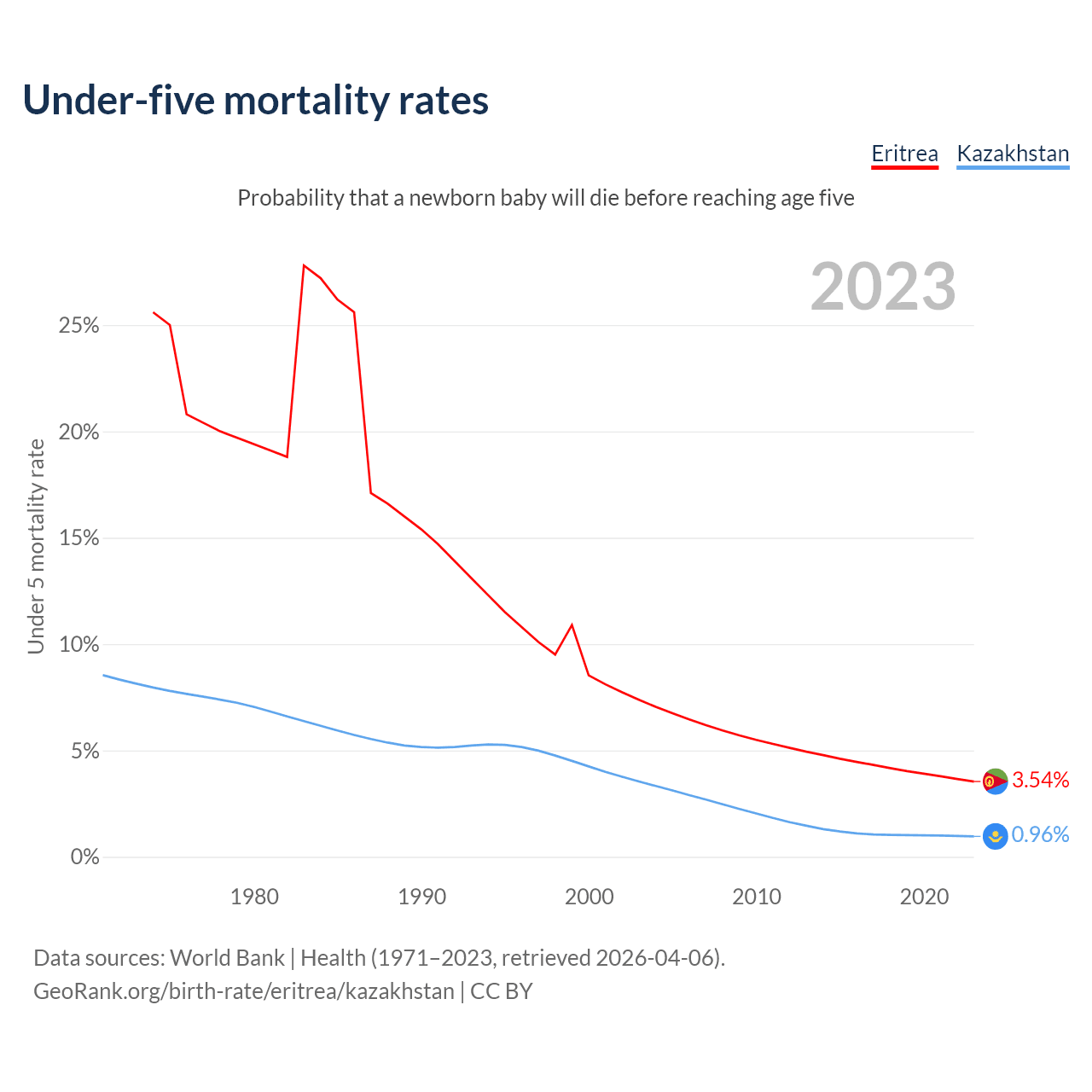The chance that a newborn baby will die before reaching age five is 3.54% in Eritrea and 0.96% in Kazakhstan. Above is a chart with historical data on under-five mortality rates.