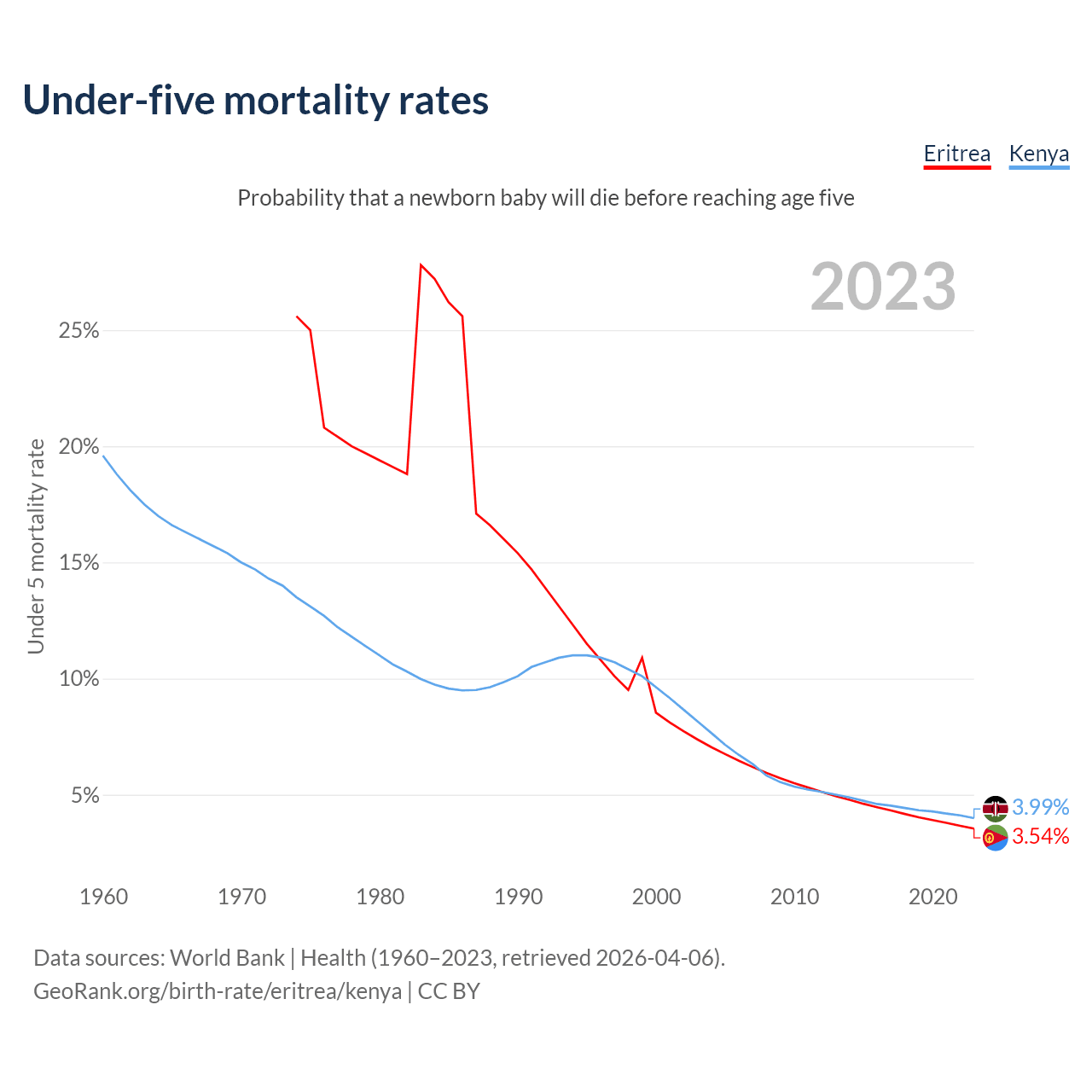 The chance that a newborn baby will die before reaching age five is 3.54% in Eritrea and 3.99% in Kenya. Above is a chart with historical data on under-five mortality rates.