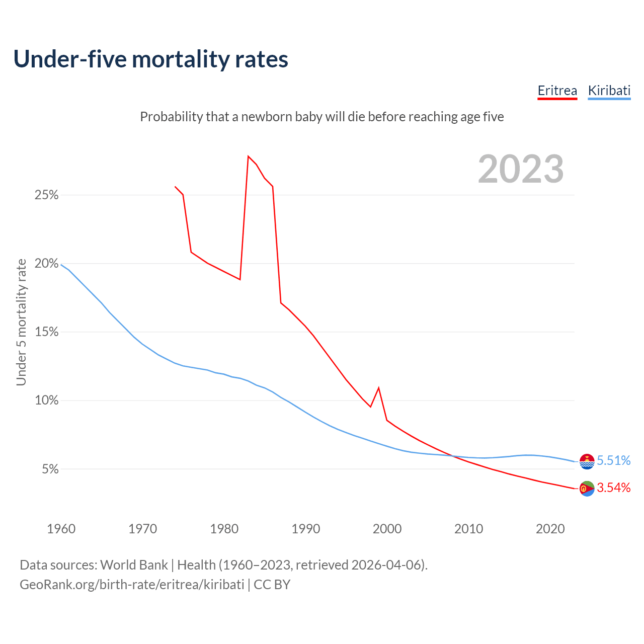 The chance that a newborn baby will die before reaching age five is 3.54% in Eritrea and 5.51% in Kiribati. Above is a chart with historical data on under-five mortality rates.