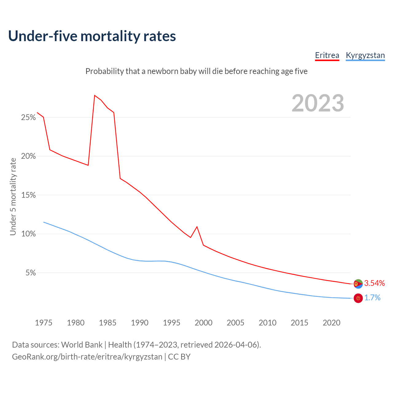 The chance that a newborn baby will die before reaching age five is 3.54% in Eritrea and 1.7% in Kyrgyzstan. Above is a chart with historical data on under-five mortality rates.