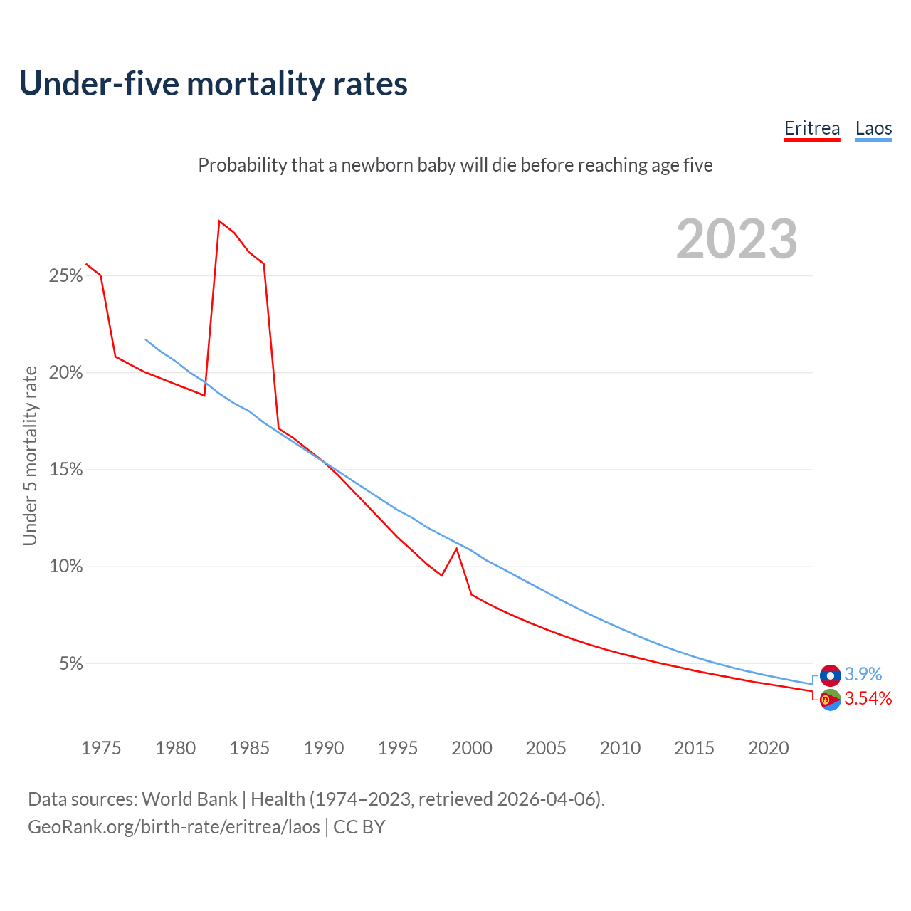 The chance that a newborn baby will die before reaching age five is 3.54% in Eritrea and 3.9% in Laos. Above is a chart with historical data on under-five mortality rates.