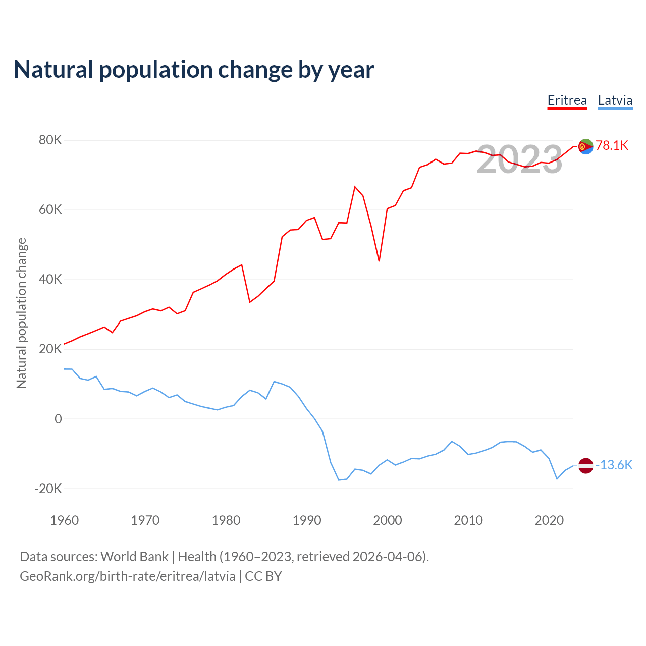 Eritrea has an annual birth rate of 28.5 births per 1,000 people, compared to 7.7 for Latvia. The average number of children a woman is expected to have during her lifetime — the fertility rate, is 3.71 in Eritrea and 1.36 in Latvia — 63.4% difference.