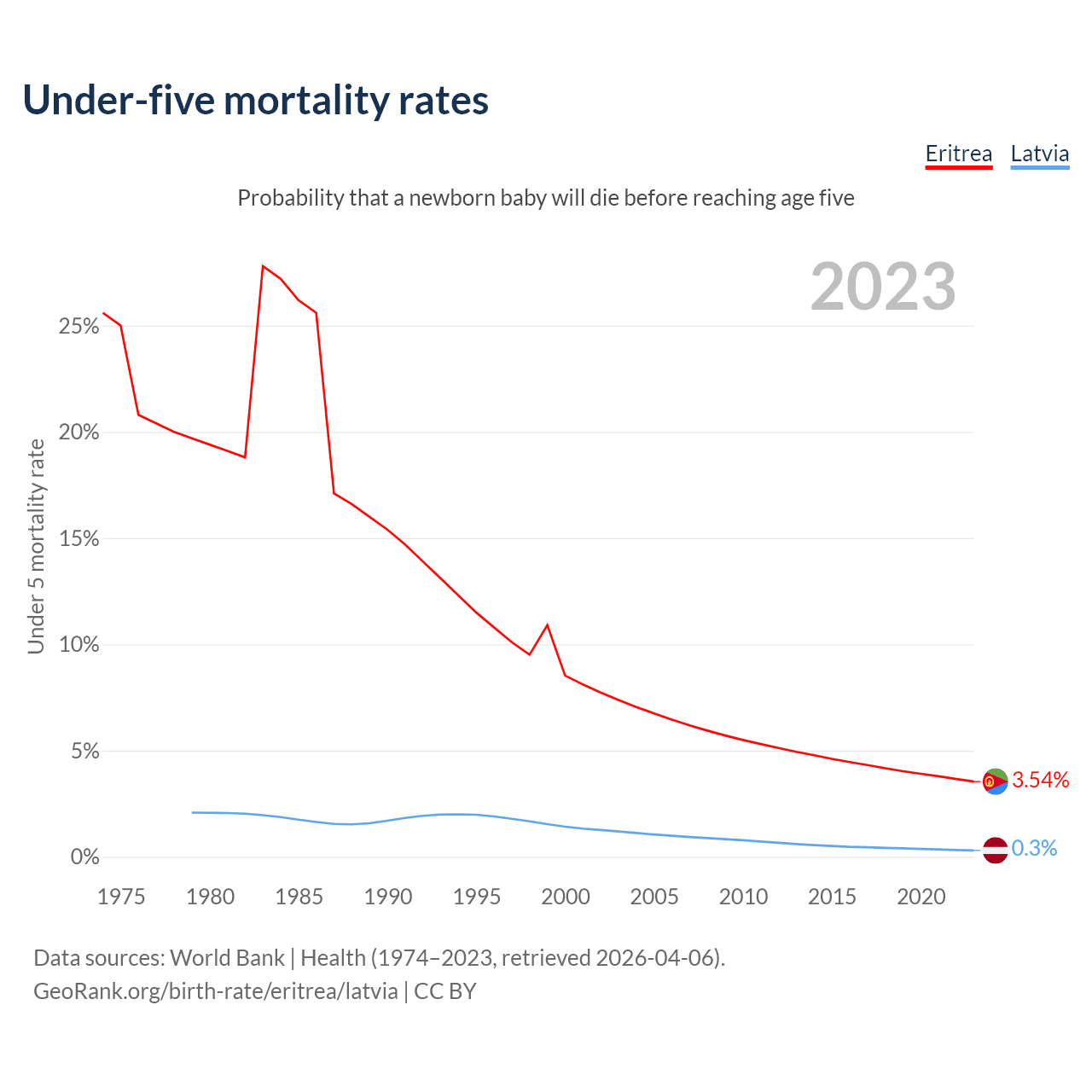 The chance that a newborn baby will die before reaching age five is 3.54% in Eritrea and 0.3% in Latvia. Above is a chart with historical data on under-five mortality rates.