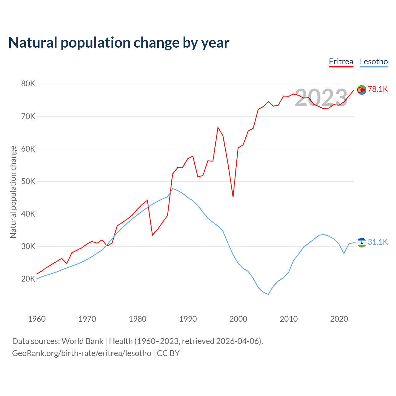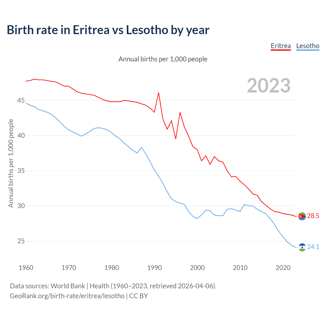 Eritrea has an annual birth rate of 28.5 births per 1,000 people, compared to 24.1 for Lesotho. The average number of children a woman is expected to have during her lifetime — the fertility rate, is 3.71 in Eritrea and 2.69 in Lesotho — 27.4% difference.