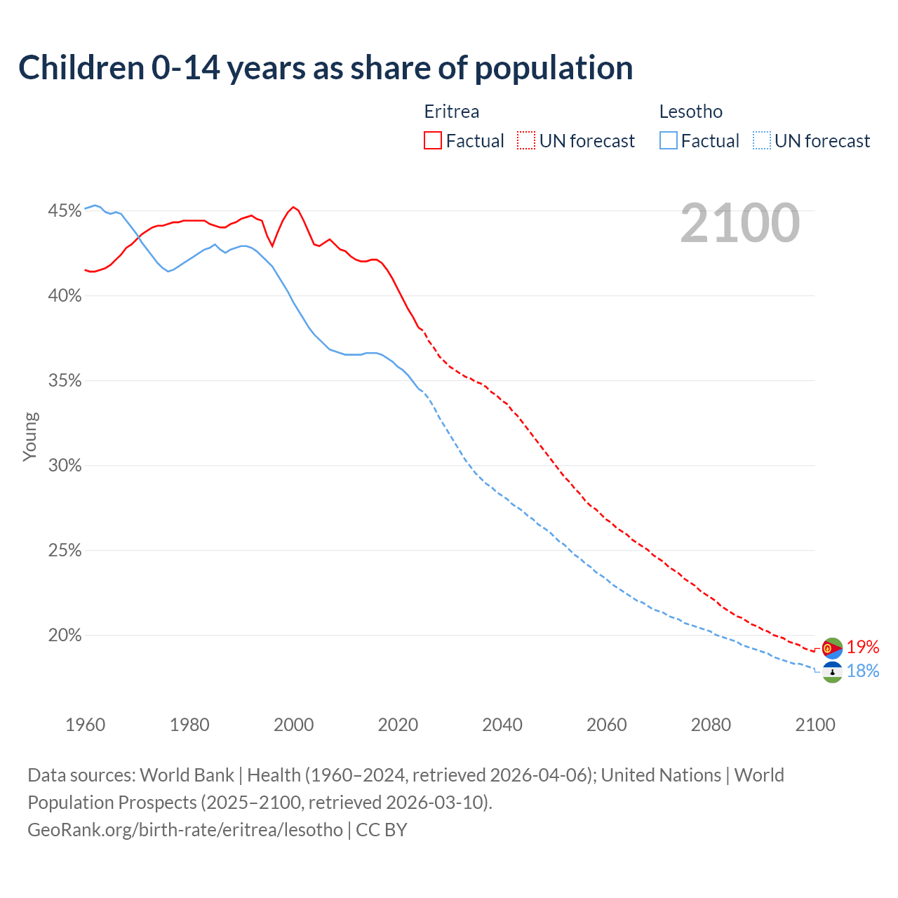 According to the latest available data on birth rates, the fertility rate in Eritrea was 3.71 children per woman in 2023, compared to 2.69 in Lesotho in 2023. The replacement level is considered to be 2.1 children per woman.