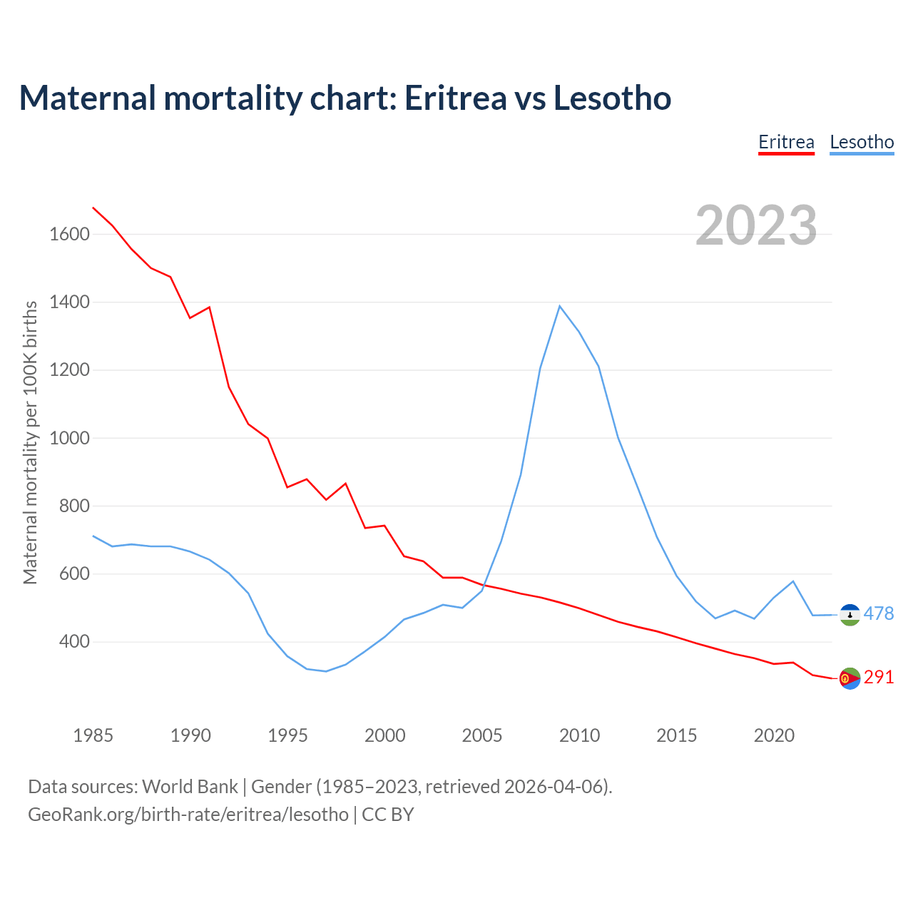The maternal mortality rate, which is the probability of dying during childbirth or within 42 days of pregnancy termination, is 291 deaths per 100,000 live births in Eritrea, compared to 478 deaths in Lesotho.