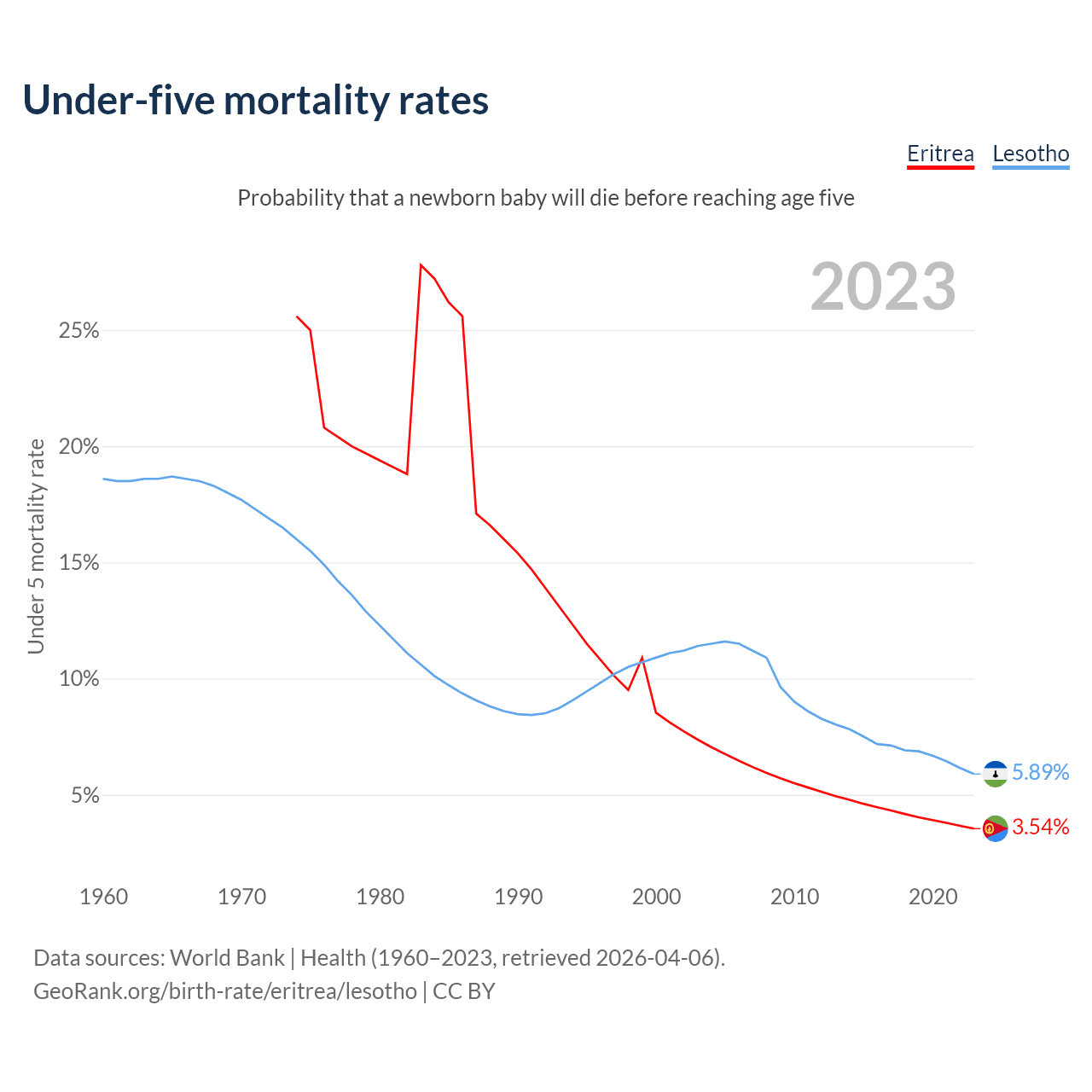 The chance that a newborn baby will die before reaching age five is 3.54% in Eritrea and 5.89% in Lesotho. Above is a chart with historical data on under-five mortality rates.