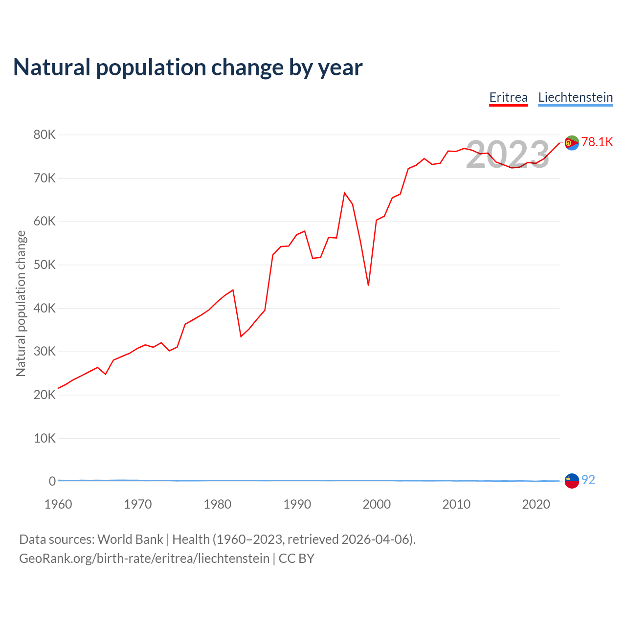 Eritrea has an annual birth rate of 28.5 births per 1,000 people, compared to 9.1 for Liechtenstein. The average number of children a woman is expected to have during her lifetime — the fertility rate, is 3.71 in Eritrea and 1.45 in Liechtenstein — 60.9% difference.
