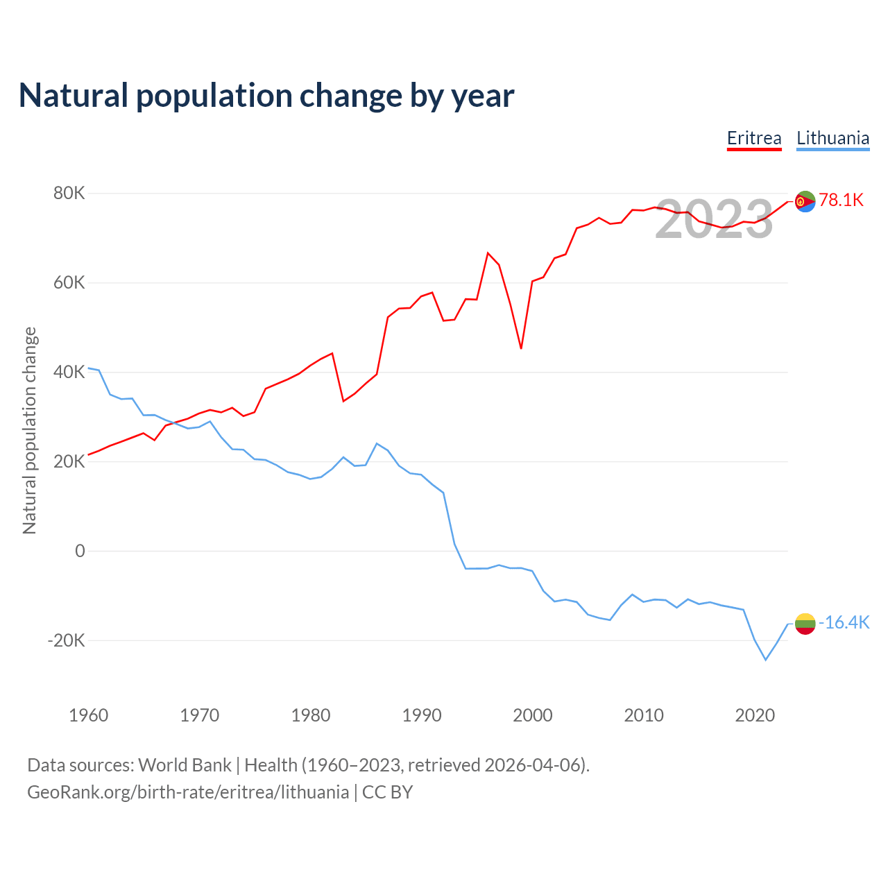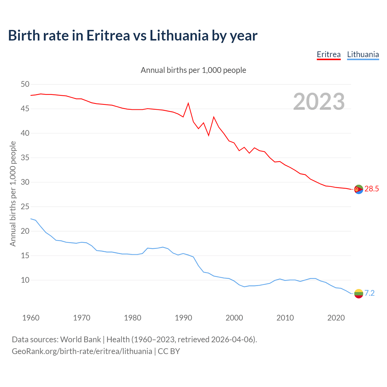 Eritrea has an annual birth rate of 28.5 births per 1,000 people, compared to 7.2 for Lithuania. The average number of children a woman is expected to have during her lifetime — the fertility rate, is 3.71 in Eritrea and 1.18 in Lithuania — 68.2% difference.