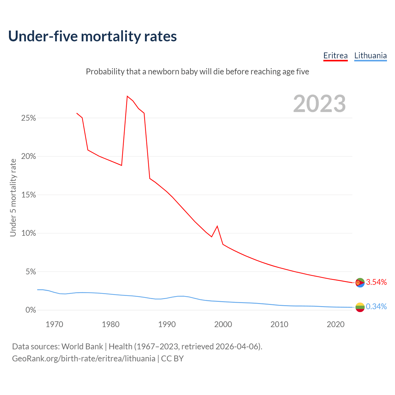 The chance that a newborn baby will die before reaching age five is 3.54% in Eritrea and 0.34% in Lithuania. Above is a chart with historical data on under-five mortality rates.