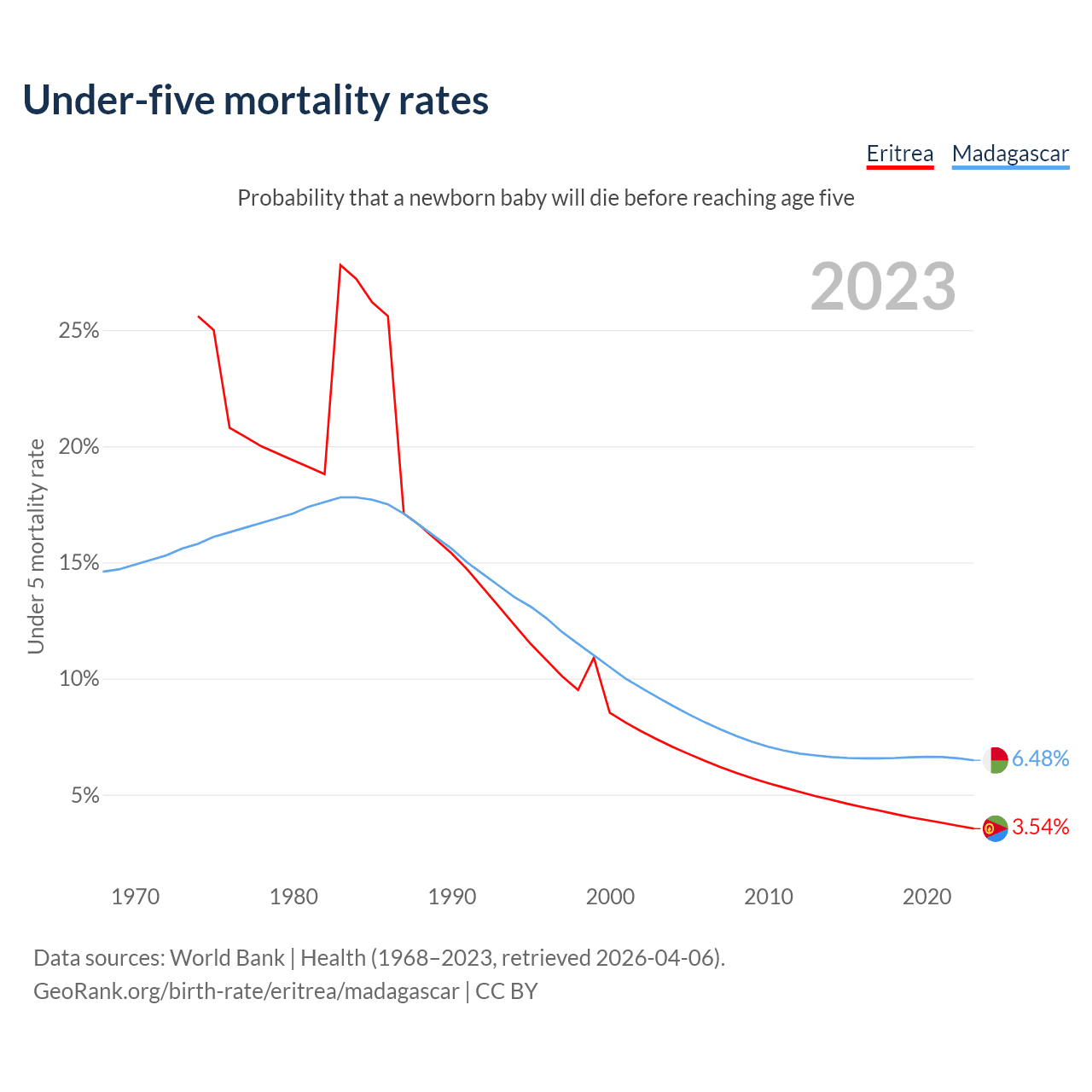 The chance that a newborn baby will die before reaching age five is 3.54% in Eritrea and 6.48% in Madagascar. Above is a chart with historical data on under-five mortality rates.