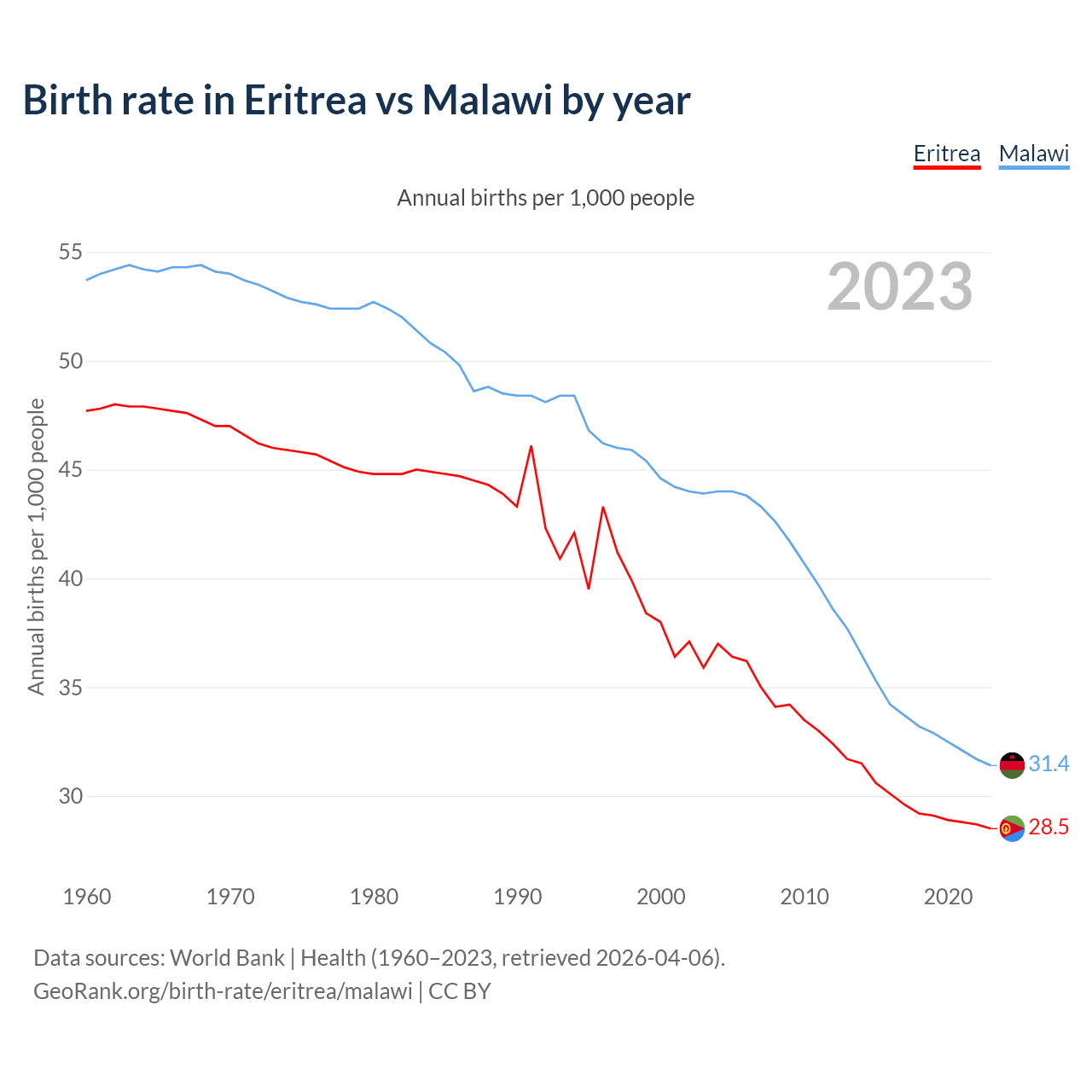 Eritrea has an annual birth rate of 28.5 births per 1,000 people, compared to 31.4 for Malawi. The average number of children a woman is expected to have during her lifetime — the fertility rate, is 3.71 in Eritrea and 3.65 in Malawi — 1.75% difference.