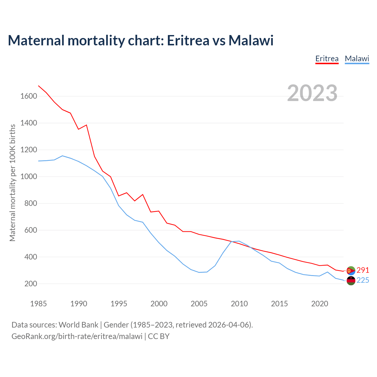 - Annual births per 1,000 women ages 15-19 (adolescent birth rate or teenage mother rate) is 65.2 in Eritrea vs 113.6 in Malawi.