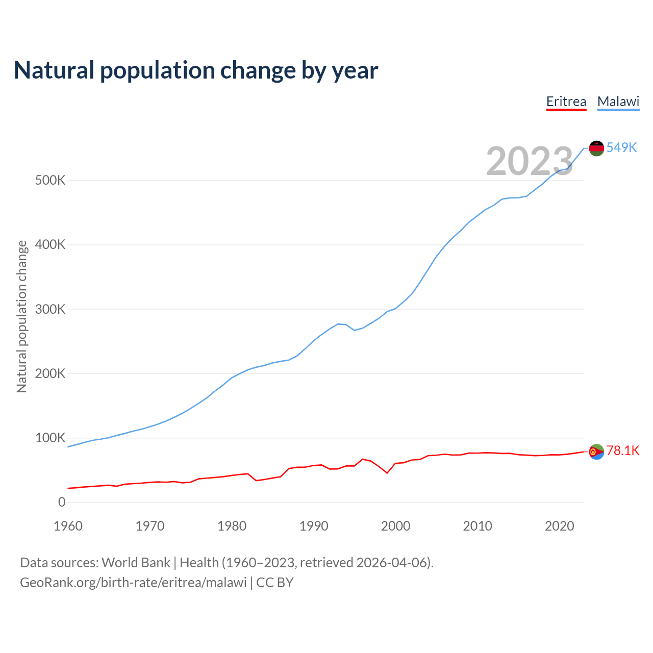 According to the latest available data on birth rates, the fertility rate in Eritrea was 3.71 children per woman in 2023, compared to 3.65 in Malawi in 2023. The replacement level is considered to be 2.1 children per woman.